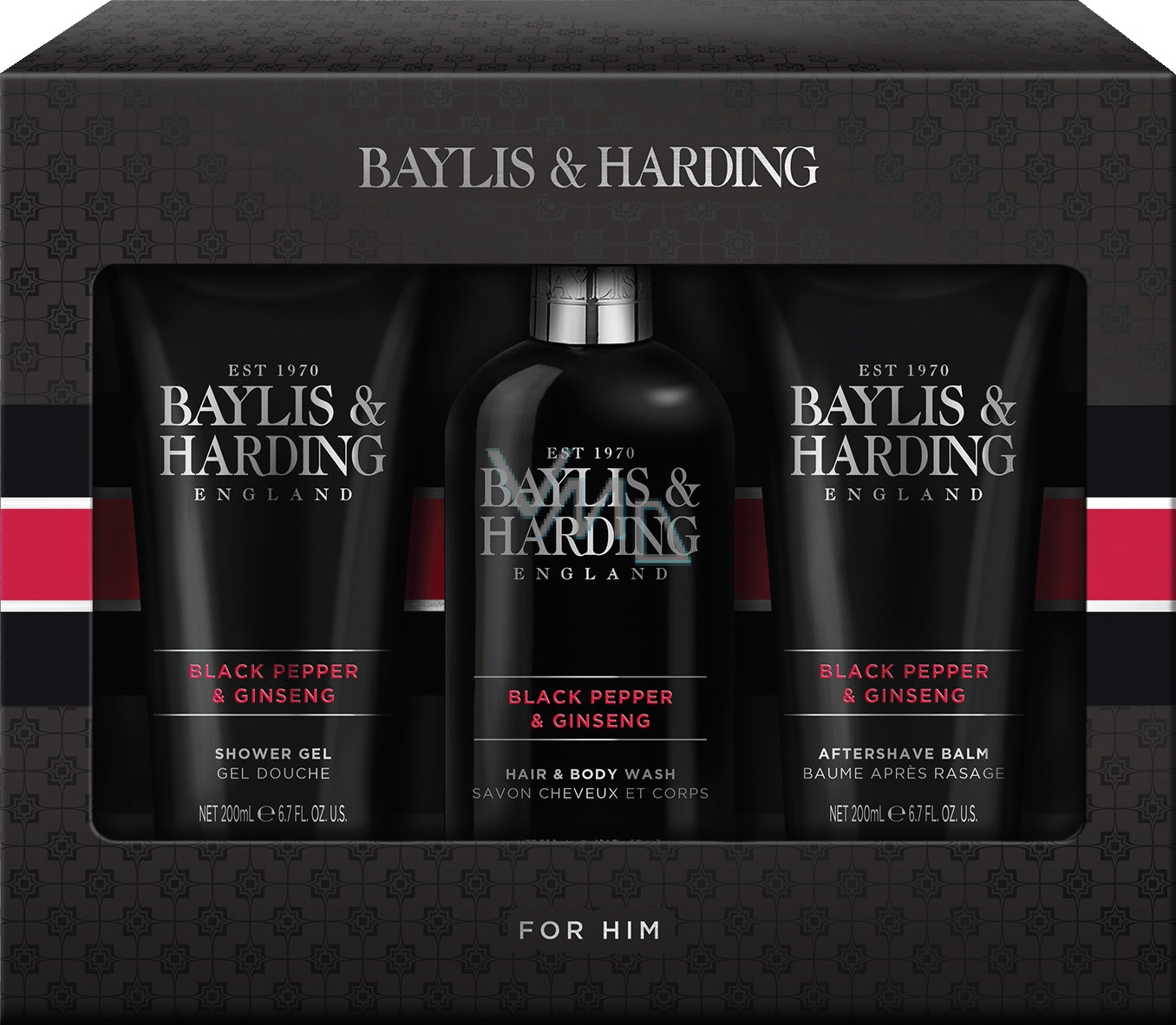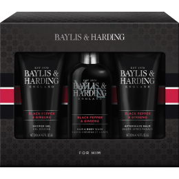 Baylis & Harding Men Black Pepper and Ginseng Körper- und Haarreinigungsgel 300 ml + After Shave Balm 200 ml + Duschgel 200 ml, Kosmetikset