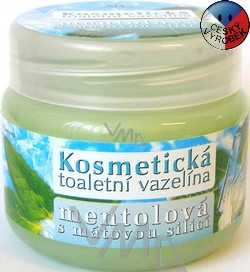 Kosmetická toaletní vazelína s peprnomátovou silicí a chladivým Mentolem zvláčňuje, promašťuje a zklidňuje popraskanou, suchou a ztvrdlou pokožku. Vhodná na ruce, nohy, rty apod. Jemná nedráždivá, bez emulgátorů a konzervačních látek. Vhodná i pro velmi citlivou pokožku. Přidaný mentol pokožku prokrví, zároveň však příjemně chladí a působí relaxačně.