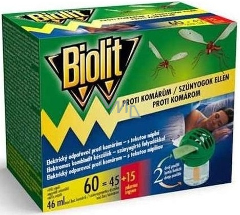 Vyzrajte na komáry, kteří se skrývají za závěsy či skříněmi s elektrickým odpařovačem od značky BIOLIT! Elektrický odpařovač s tekutou náplní na 60 nocí hubí a odpuzuje komáry, pakomáry a jiný malý hmyz. Ochrání Vás před nepříjemným hmyzem nejméně po dobu 60 nocí (1 noc = 8 až 10 hod.). Kombinovaný odpařovač lze použít i pro vyměnitelné polštářky (1 polštářek na 1 noc = 8 až 10 hod.). Používá se především v ložnicích a jiných obytných místnostech. Tento elektrický odpařovač s tekutou náplní bez parfemace vás bude efektivně chránit proti komárům až na 60 nocí. Obsahuje insekticid, který působí proti komárům včetně komárů tygřích, a to i při mírně otevřených oknech a rozsvícených světlech. Optimální pro použití v ložnicích či jiných obytných místnostech do 30 m3.