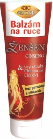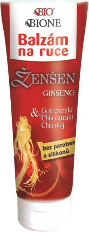 Nejcennější tradiční rostlinné extrakty spolu v moderním výrobku, balzámu na ruce. Ženšen (Ginseng), Goji (Kustovnice čínská) a Chia (Šalvěj hispánská) – tisíce let osvědčené a používané, tonizující, podpůrné, adaptogenní, antioxidační, regenerační a hojivé, tak lze označit účinky těchto rostlin. Obsažené látky, jako např. ginsenosidy, polysacharidy, glukany, phytosteroly, aminokyseliny, bio minerály, sacharidy, mastné kyseliny, aj., jsou hlavními složkami osvědčeného balzámu na ruce. Ze Šalvěje hispánské obsahuje jak olej, tak i extrakt z celých semínek. Středně tučný, výživný, ochranný a hydratační balzám s univerzálním použitím, pro všechny typy pokožky, pro celou rodinu. Balzám je velmi jemný. Jako stabilizátor využívá rostlinný polysacharid. Rychle se vstřebává, zanechává příjemný pocit. Vedle blahodárných extraktů obsahuje spoustu dalších pro pokožku významných substancí, jako jsou bambucké máslo (Karité), panthenol, allantoin, vitamín E a mandlový olej. Vyroben v BIO formulaci, neobsahuje silikony, ropné produkty, etoxyláty ani parabeny. Výrobek šetrný k Vám i k přírodě. Použitá konzervační látka se po nanesení přípravku na pokožku postupně odpařuje. Ženšen – „fontána věčného mládí“ Chia – „poklad aztéckých běžců“ Goji – „rudý diamant, elixír mládí“.