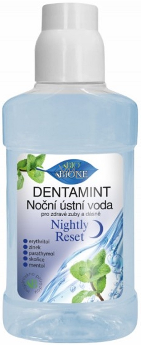 Noční ústní voda se zesílenou účinností Dentamint od Bione Cosmetics efektivně bojuje proti ústním mikrobům. Vědecké studie opakovaně prokazují zásadní vliv zhoršeného zdravotního stavu ústní dutiny na zdraví celého organismu. Určité bakterie ústní mikroflóry procházejí do krve, způsobují stálou imunitní odezvu a tím i trvalý celotělový zánět se všemi zdravotními důsledky. Bakterie Porphyromonas gingivalis z ústního mikrobiomu krevním řečištěm přechází i do mozku a ukazuje se, že může být hlavní příčinou vzniku a rozvoje Alzheimerovy choroby!