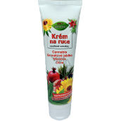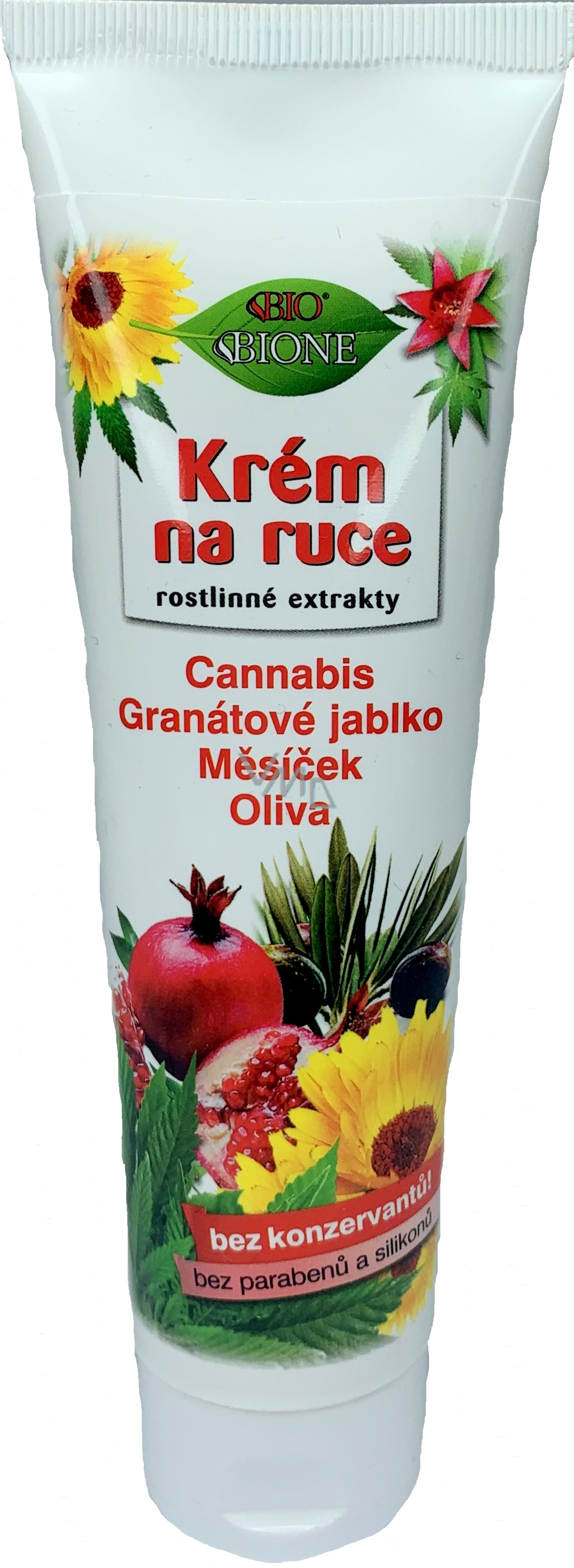 Krém na ruce s rostlinnými extrakty je kvalitní, středně tučný, výživný, ochranný a hydratační krém s univerzálním použitím pro všechny typy pokožky. Obsahuje olivový olej, olej z konopí setého, šťávu z granátových jablek a extrakt měsíčku lékařského a z konopí.