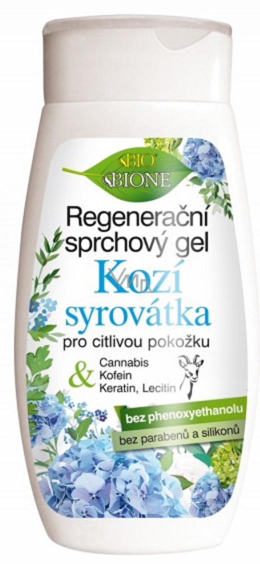 Sprchový gel pro citlivou pokožku. Obsahuje tradiční osvědčené aktivní složky v moderním spojení s dalšími účinnými látkami. Osvědčený základ gelů Bione s přídavkem kozí syrovátky a extraktu Cannabis je doplněn o oblíbený Lecithin a panthenol, obsahuje populární kofein. Účinnou složkou gelu pro zregenerování je hydrolyzát Keratinu. Kozí syrovátka obsahuje imunoglobuliny, laktoferin, laktoperoxidázu, Aminokyseliny, kompletní řadu vitamínů B, Vitamín H, bio Minerály jako vápník, draslík, Železo, jód, měď, Kobalt, Zinek, dále laktózu, organické a Mastné kyseliny, kasein a řadu dalších složek.