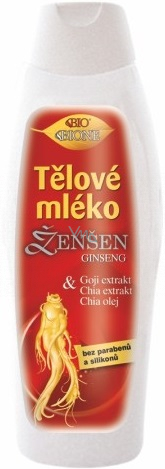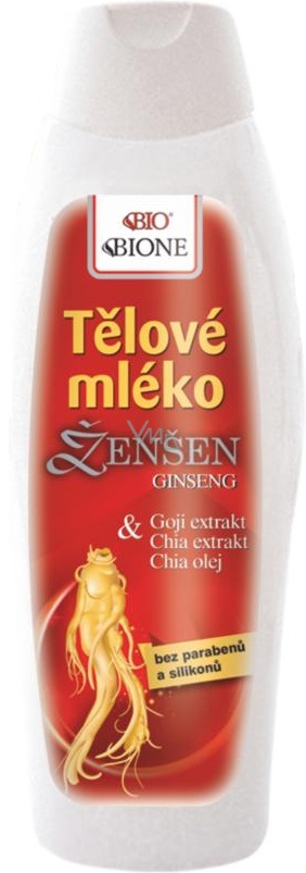 Nejcennější tradiční rostlinné extrakty spolu v moderním tělovém mléku. Ženšen (Ginseng), Goji (Kustovnice čínská) a Chia (Šalvěj hispánská) – tisíce let osvědčené a používané, tonizující, podpůrné, adaptogenní, antioxidační, regenerační a hojivé, tak lze označit účinky těchto rostlin. Obsažené látky, jako ginsenosidy, polysacharidy, glukany, phytosteroly, aminokyseliny, bio minerály, sacharidy, mastné kyseliny, aj., jsou hlavními složkami osvědčeného mléka BIONE. Arganový olej je další cennou složkou obsahující nenasycené mastné kyseliny, squalen a antioxidanty – látky chránící a zvláčňující zvláště suchou pokožku. Vlivem povětrnosti je pokožka těla přes den namáhána a vysoušena. Uvolňují se „stresové“ hormony, které způsobují destrukci vlastních podkožních struktur, což má za následek ztrátu tonusu a pružnosti pokožky a vznik vrásek. Tělové mléko pokožku zvláční, hydratuje a doplní chybějící tuky. Allantoin a panthenol podporují obnovu buněk pokožky, glycerin hydratuje, bambucké máslo promašťuje a zvláčňuje.