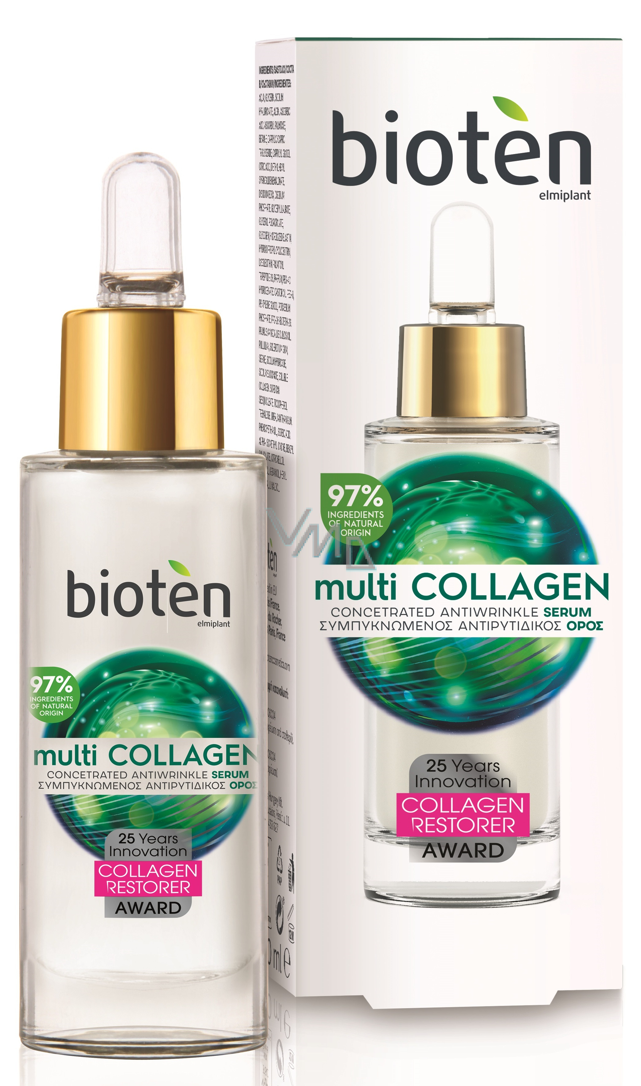 Bioten multi Collagen koncentrované sérum proti vráskám s 97 % ingrediencí přírodního původu je průlomovým přípravkem proti vráskám, který obsahuje Collagen Restorer, oceněný protivráskový peptid, aktivní přírodní kolagen, který pomáhá obnovit kolagen ve škáře, kyselinu hyaluronovou s nízkou molekulární hmotností, která proniká do nejhlubších vrstev pokožky, kde redukuje vrásky, H2O Intense, které působí jako hydratační rezerva i jako ochranný film na povrchu pokožky, a přírodní mandlový olej. Dopřejte své pleti hydratační péči od značky bioten.