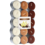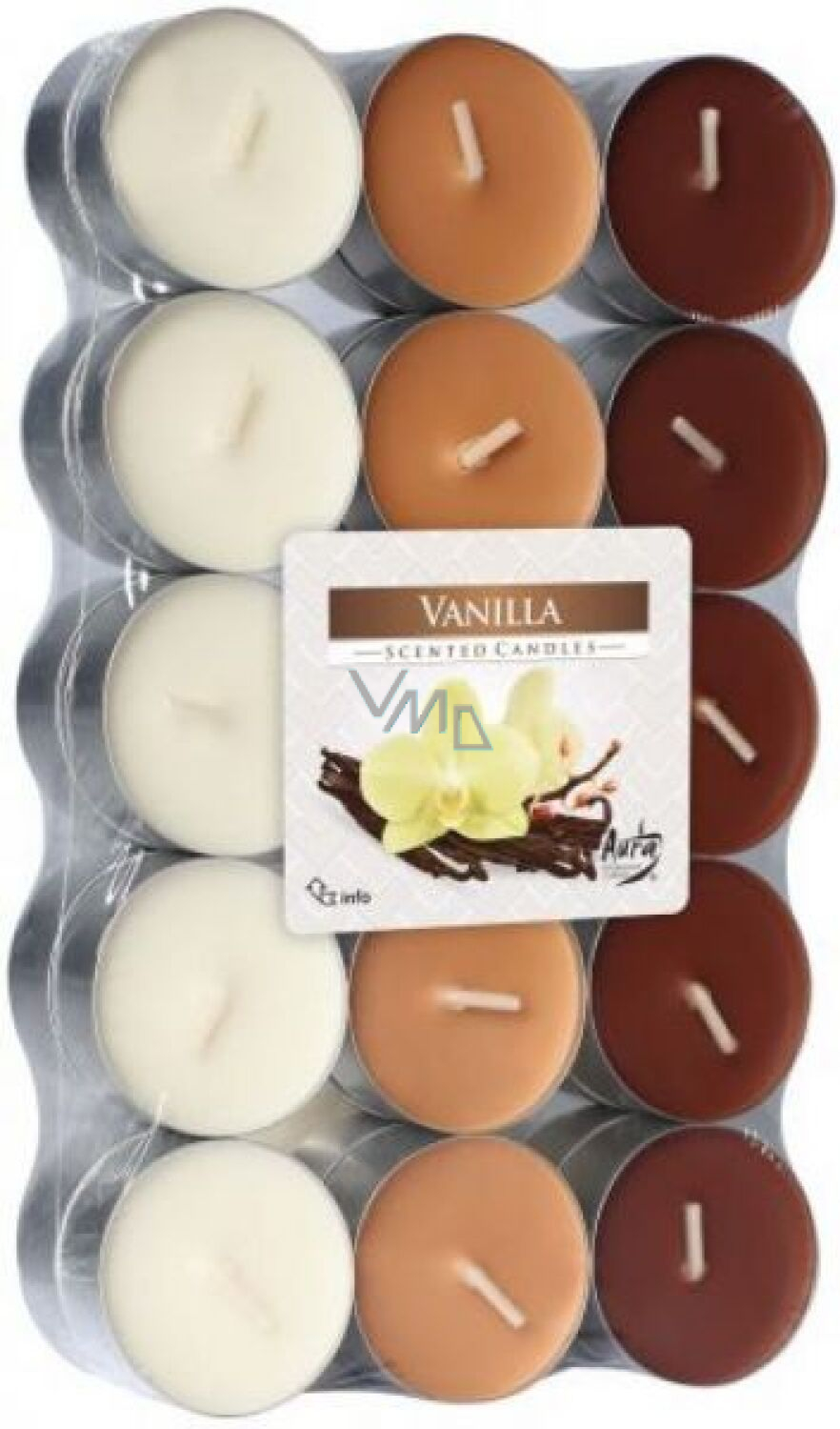 AURA Teelicht Duftkerze 30 Stück Teelichter mit angenehmem Duft. In der Verpackung sind 30 Stück Teelichter. Teelichter in Weiß, Hellbraun und Dunkelbraun mit Vanilleduft in einer Aluminiumschale.