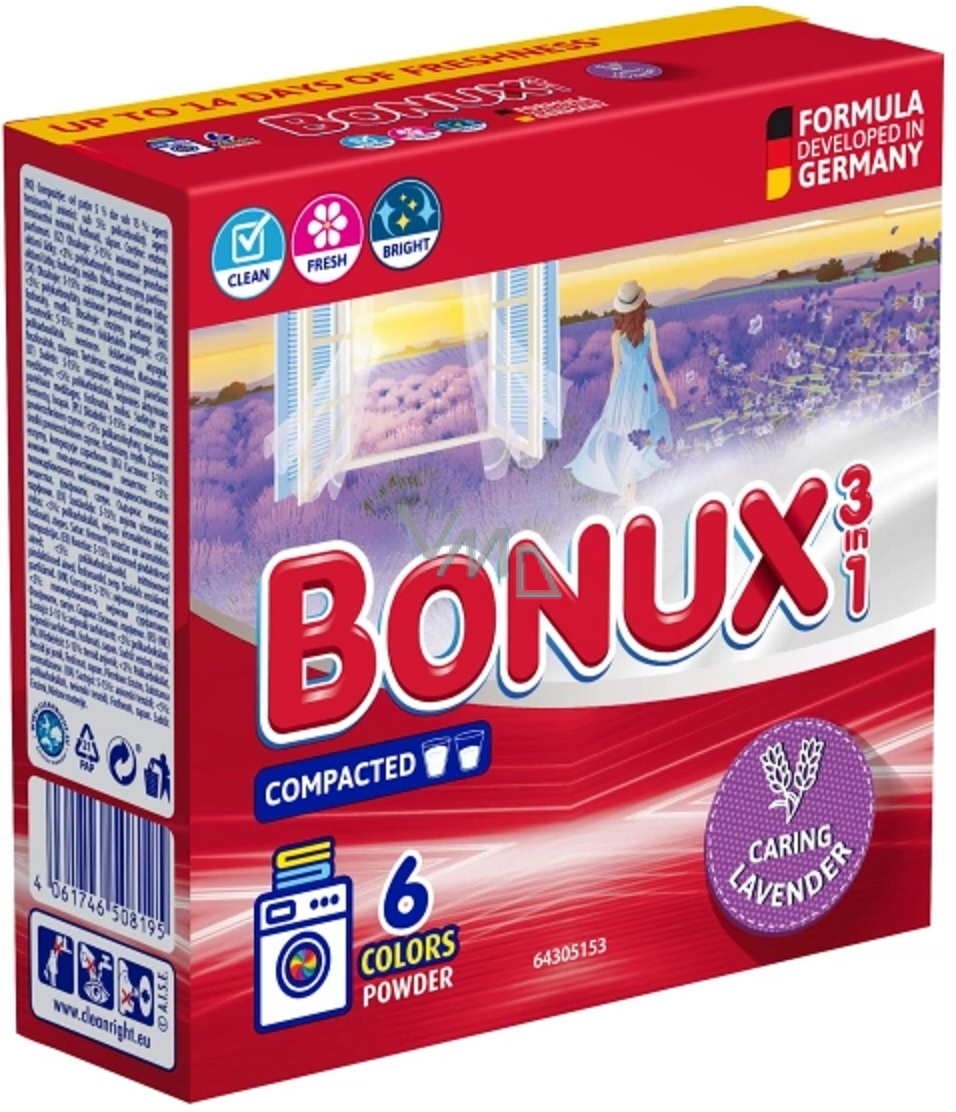 Bonux Color Caring Lavender na barevné prádlo s vůní levandule a jeho složení 3v1 vám při náročném praní pro celou rodinu pomůže. Dodává vašemu prádlu dlouhotrvající svěžest. Není vhodný pro vlnu a hedvábí. Skvěle odstraňuje skvrny, propůjčuje prádlu svěžest a není drahý. Chytré složení se třemi výhodami v jednom balení od Bonuxu! A celá rodina může být spokojená!