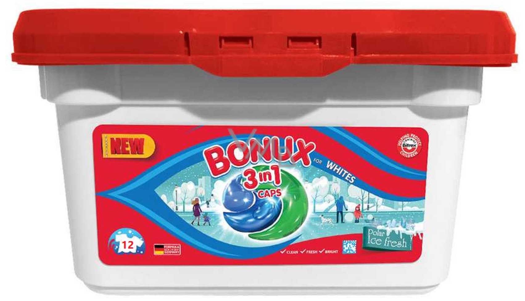 Bonux 3v1 s jedinečnou svěží vůní je určený na bílé prádlo. Gelové kapsle Bonux White Polar Ice Fresh je chytrý výběr za fantastickou cenu. Dostanete dobrou prací sílu a svěží vůni, jakou byste čekali jen od těch nejlepších a nejdražších pracích prostředků. Obsahuje aktivní částice pro dokonalé praní a složku zabraňující usazování vodního kamene, můžete prát při teplotách od 30 °C. Nepoužívejte na vlnu a hedvábí.