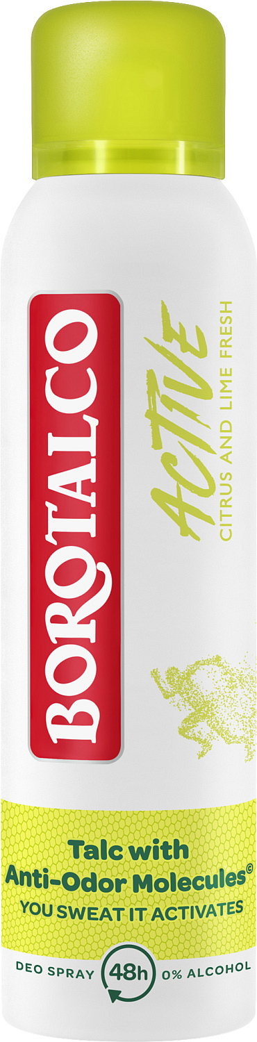 Borotalco Deo-Spray Active mit Zitrusduft absorbiert dank seiner effektiven Formel Schweiß und lässt die Haut in der Achselhöhle 48 Stunden lang trocken und geschützt. Der aktive Deo-Spray mit innovativer Odor-Converter-Technologie enthält Mikrokapseln, die aktiviert werden, wenn Sie schwitzen und sich bewegen. Die Mikrokapseln geben zusätzlichen Duft genau dann frei, wenn Sie die zusätzliche Wirkung am meisten benötigen. Die Effektivität wurde auch bei hoher körperlicher Belastung getestet. Duft Citrus: Spritzige Noten, die den Herzen der Zitrusfrüchte in einer modernen Neuinterpretation des ursprünglichen Borotalco-Duftes den Weg ebnen.