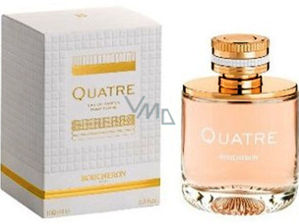Das Damenedition Quatre ist ein blumig-fruchtiger Duft mit einer holzigen Basis. Eröffnet wird er mit Akkorden von Bitterorange, rotem Johannisbeere, grüner Mandarine, Zitrone und Grapefruit. Sambac-Jasmin und Rose bilden das Herz, zusammen mit Akkorden von Walderdbeeren, Pfirsich und Apfel. Die Basis enthält Töne von goldenen Hölzern, Zeder, Kaschmir, Moschus, Vanille und Karamell.
