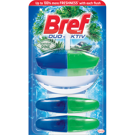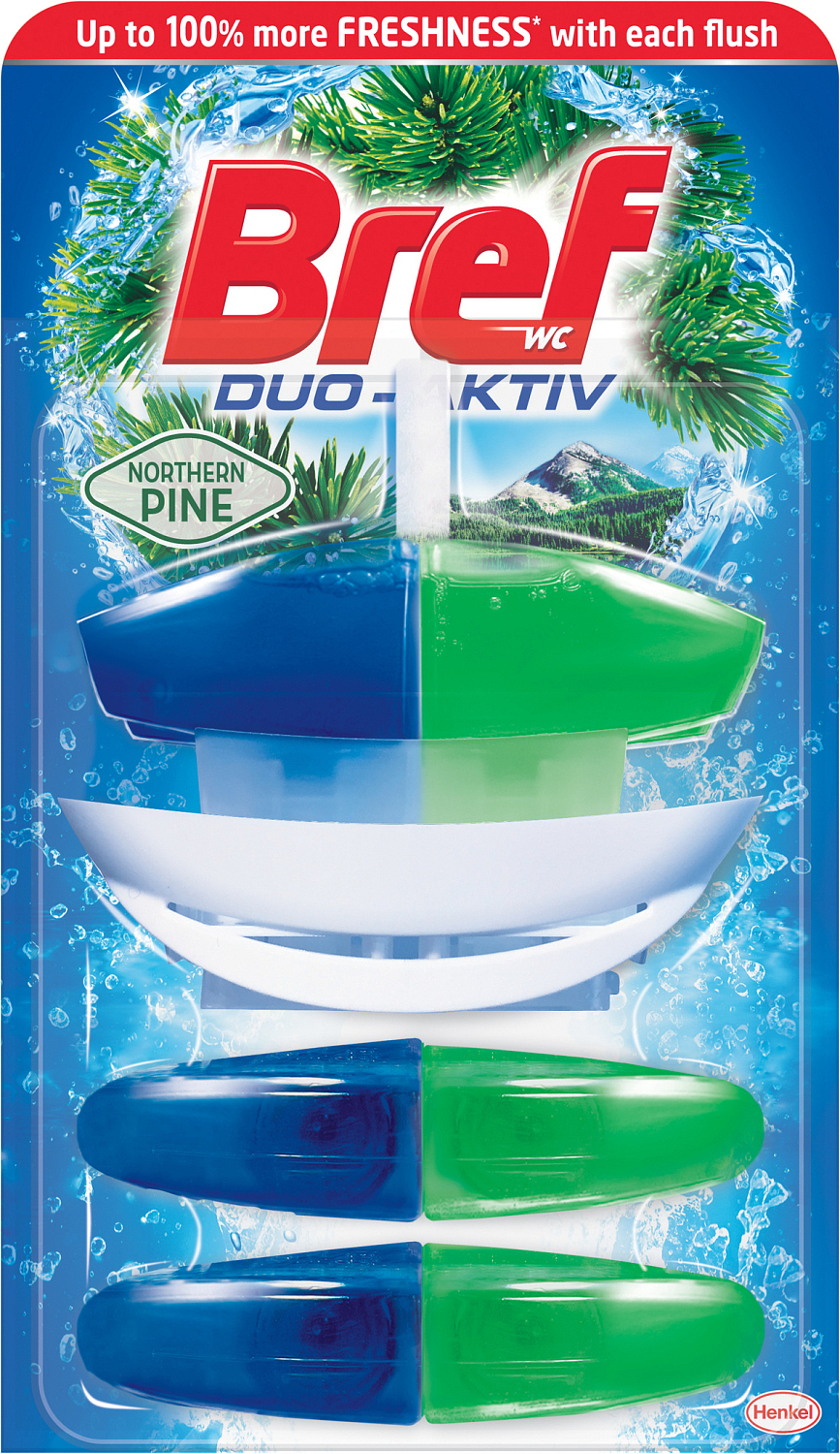 Bref Duo-Aktiv = Hygienický čistič + dlouhotrvající svěží vůně. Kombinace intenzivní dlouhotrvající vůně a hygienické čistoty s každým spláchnutím. Levá komora WC bloku skrývá vylepšený modrý tekutý WC čistič s ještě aktivnějším složením, který se uvolňuje s každým spláchnutím do toaletní mísy, kde odstraňuje nečistoty a vodní kámen. Z pravé komory se zároveň uvolní intenzivní, dlouhotrvající vůně s větším obsahem parfémové složky, takže celá vaše toaleta je dokonale čistá a provoněná.