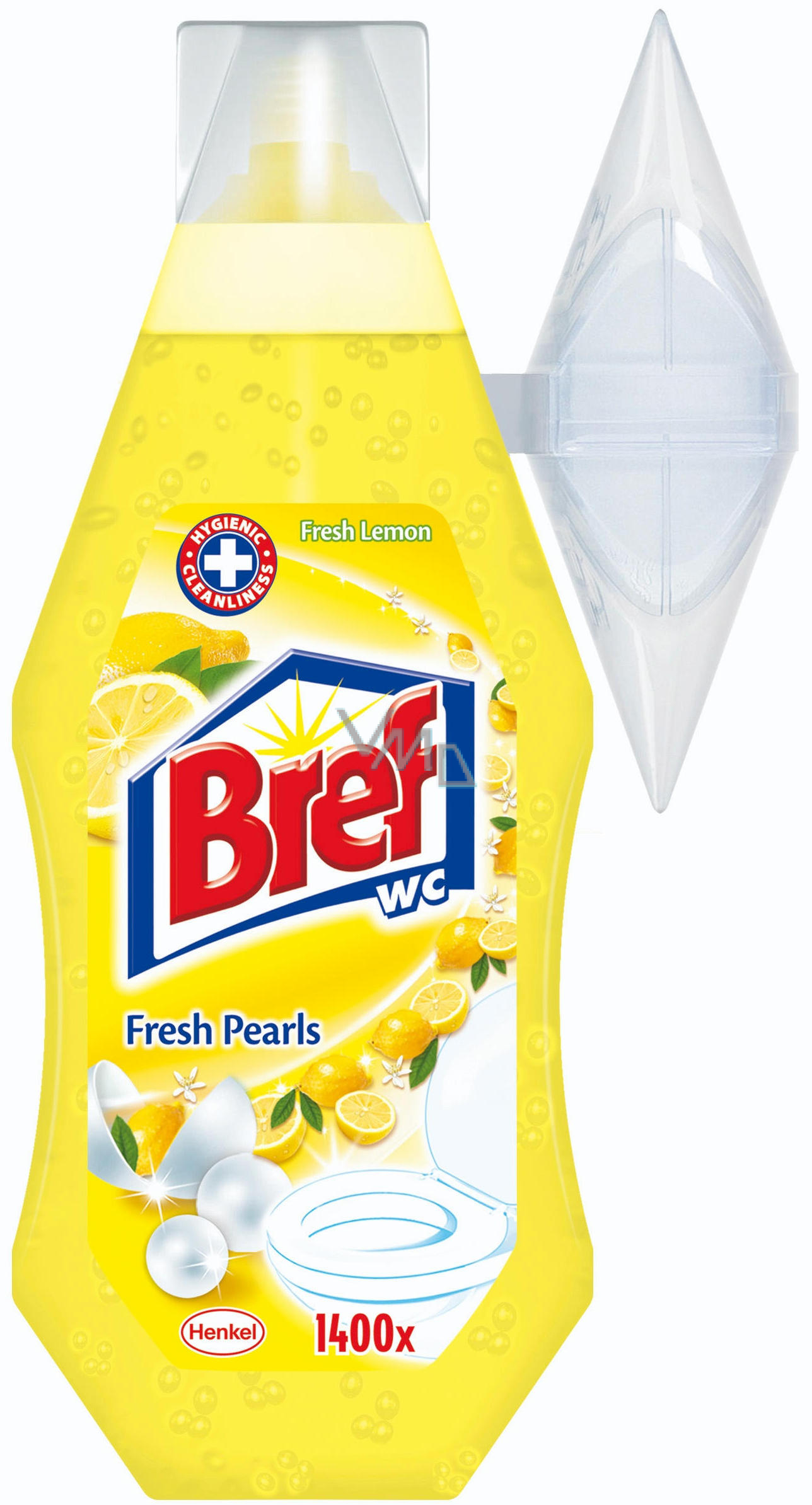 Bref Fresh Pearls Fresh Lemon je gelový čistič a osvěžovač, odstraňující rez, vodní kámen a nečistoty z toalet, tu zanechává svěží a hygienicky čistou. Užijte si hygienickou čistotu a úžasnou svěží vůni při každém spláchnutí. Díky praktickému košíčku, který je součástí balení se WC gel velice pohodlně doplňuje. Jedno balení Bref Fresh Pearls Fresh Lemon vystačí až na 1400 spláchnutí.