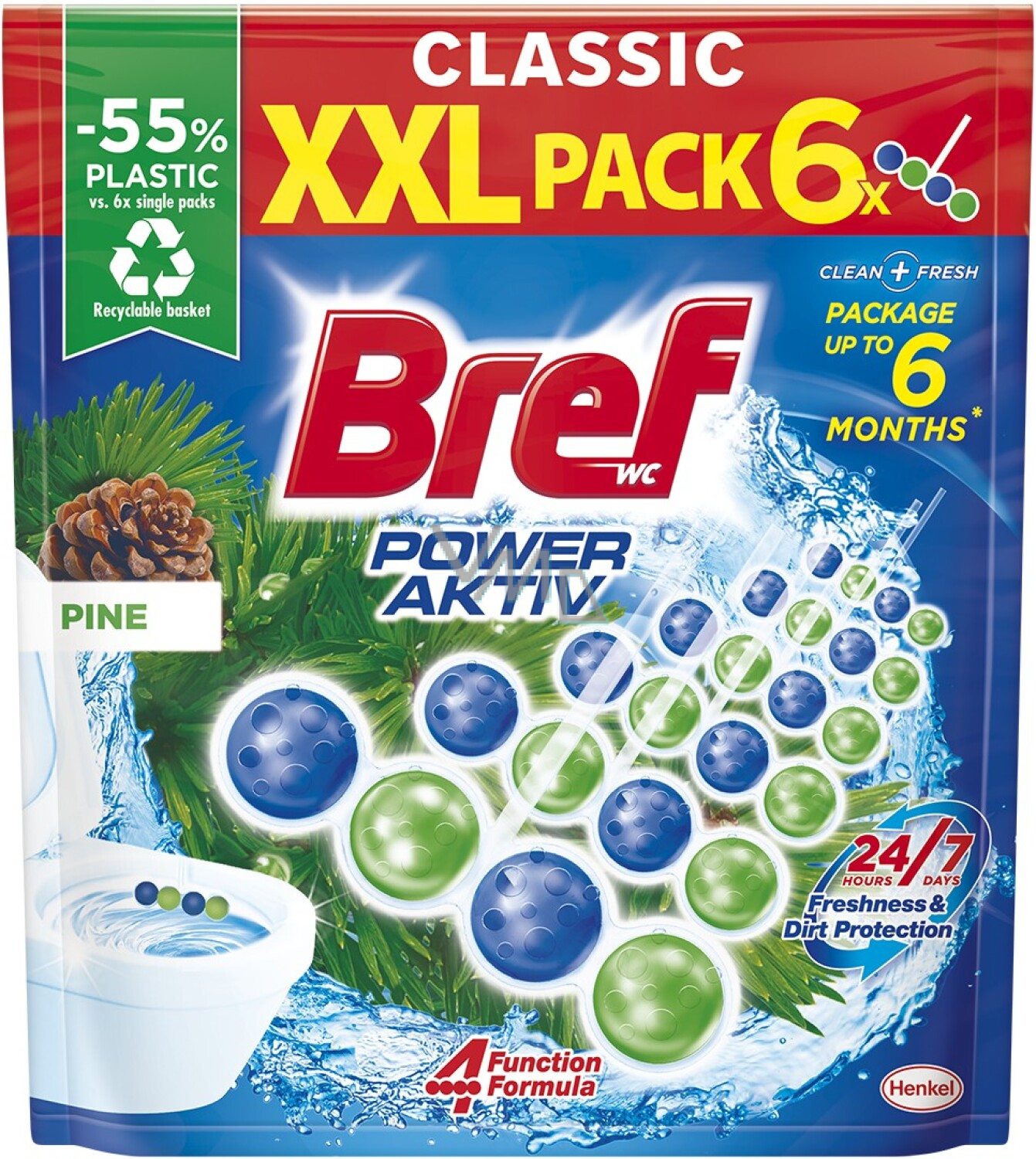 Bref Power Aktiv WC blok mit Pine- Duft, mit 50 % größerer Wirkung gegen Kalkablagerungen* und 55 % weniger Kunststoff. Suchen Sie einen einfacheren Weg, um Ihre Toilette sauber und frisch zu halten? Der Bref WC Block bietet einen einfachen und bequemen Weg, um die Sauberkeit und Frische Ihrer Toilette für bis zu 6 Monate** zu gewährleisten. Bref Power Aktiv kommt jetzt auch mit 50 % größerer Wirkung gegen Kalkablagerungen* für eine sauberere und glänzendere Toilette. Hängen Sie einfach den WC Block am Rand der Toilette auf und richten Sie ihn in den Wasserstrom. Nach dem Spülen erleben Sie in Ihrem Badezimmer die Sauberkeit und Frische der Fichte.