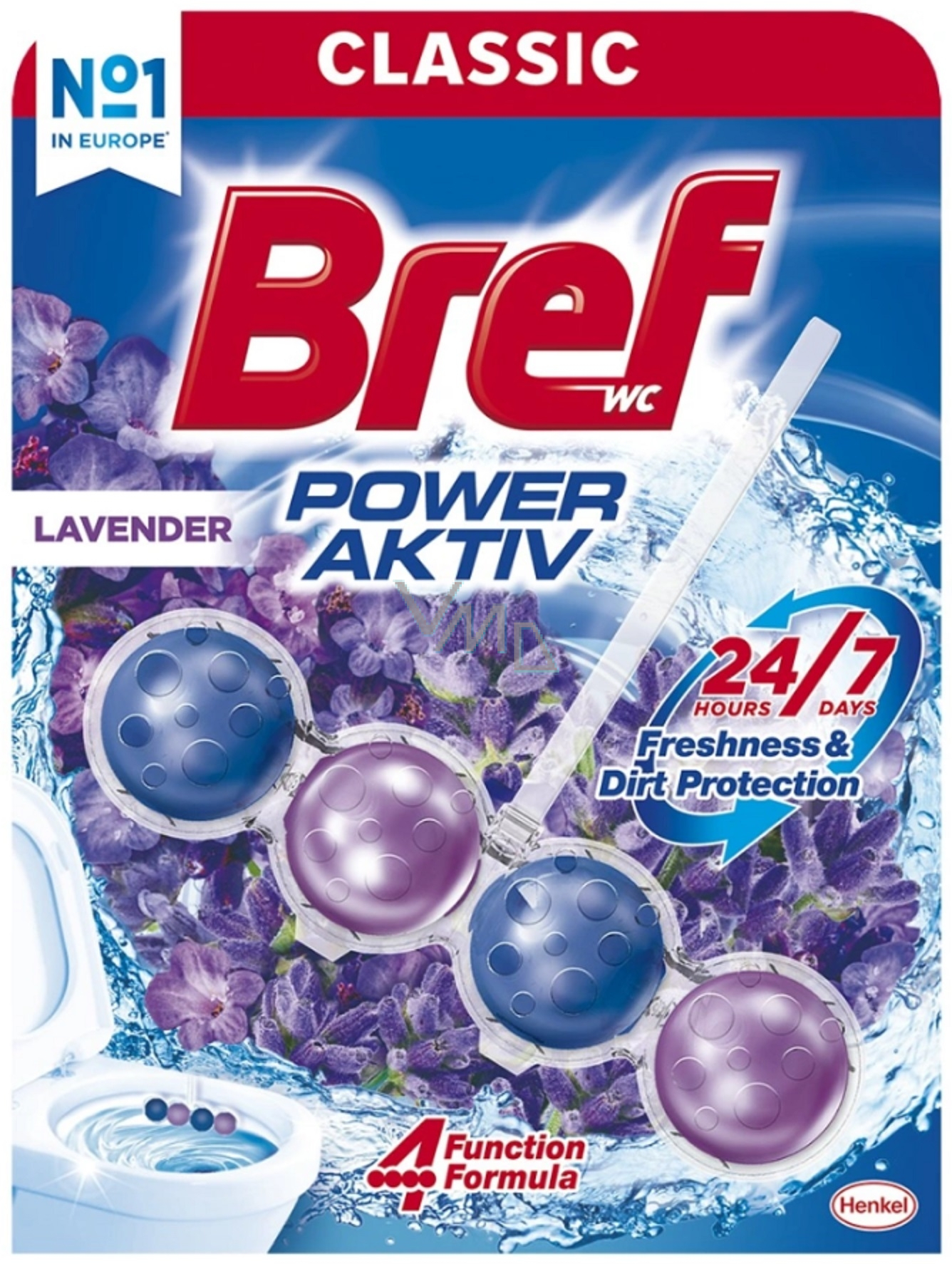 Bref Power Aktiv: je složen ze 4 kuliček uložených v průhledném nerozebíratelném košíku, které jako jeden tým zvládnou více funkcí při každém spláchnutí - hygienickou čistotu, příjemnou vůni, odstranění usazenin a vytvoření bohaté pěny pro lesk a bělost toalety.