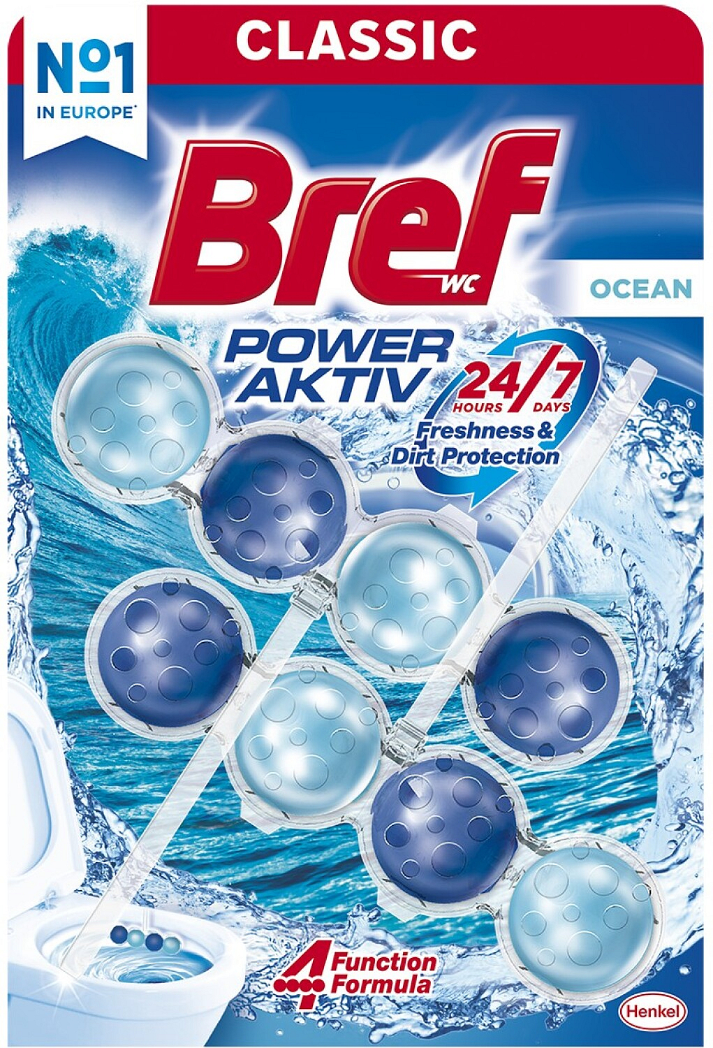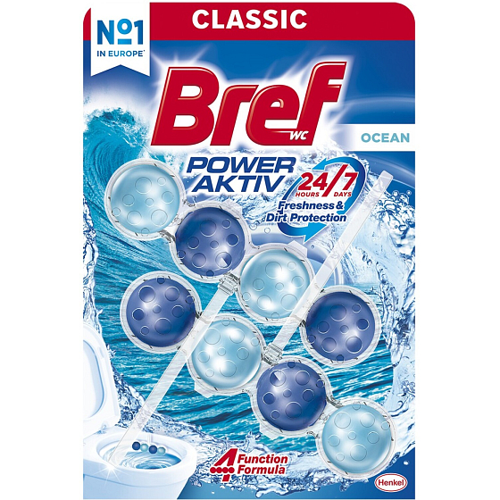 Bref Power Aktiv WC Block mit dem Duft des Ozeans und einem um + 50 % höheren Effekt gegen Kalkablagerungen (Nach mehreren Spülungen im Vergleich zu einer unbehandelten Toilettenoberfläche.)