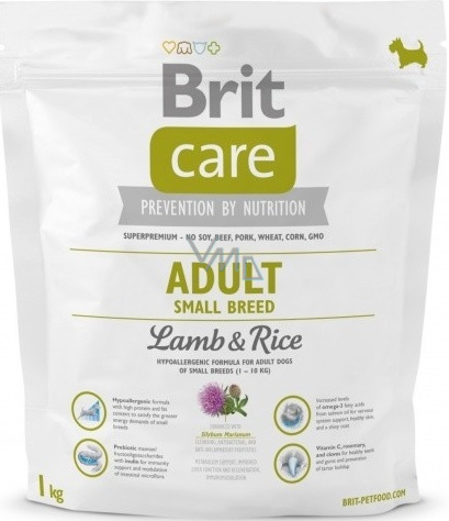Brit Care adult small breed lamb & rice je superprémiové krmivo pro dospělé psy malých plemen (do 10 kg). Základ krmiva tvoří jehněčí maso a rýže.
