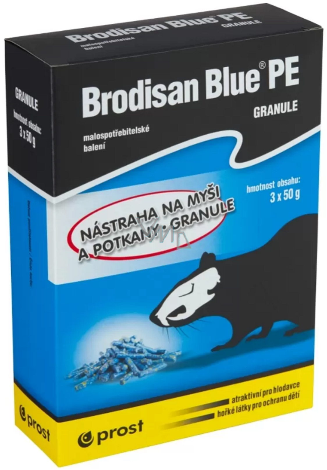 Obsahuje přípravek na hubení hlodavců Brodisan Blue MM s úč. látkou brodifakum. V případě nehody volejte Toxikologické informační středisko. Při manipulaci s přípravkem používejte ochranné rukavice, nejezte, nepijte, nekuřte. Po ukončení činnosti si umyjte ruce a případně znečištěnou kůži mýdlem a vodou. Deratizační staničky je nutné kontrolovat nejdříve za 5-7 dnů od zahájené deratizace a následně nejméně jednou týdně s cílem ověřit, zda je nástraha akceptována, deratizační staničky jsou neporušené a za účelem sběru uhynulých hlodavců. V případě potřeby nástrahu doplnit. Znečištěnou nebo znehodnocenou návnadu odstranit. Pokud během 35 dnů od zahájení deratizace nedojde k potlačení výskytu hlodavců, vyžádejte si radu od dodavatele přípravku nebo se obraťte na deratizační službu. Přípravek a hlodavci intoxikování přípravkem mohou být nebezpeční pro děti, necílová zvířata a ptáky.