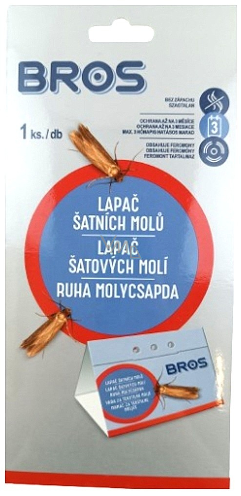 Past bez zápachu pro monitorování přítomnosti molů šatních ve skříních a zásuvkách. Zachovává si účinnost po dobu až 3 měsíců. Neobsahuje chemické insekticidy. Monitorování přítomnosti molů je možné díky feromonu, který účinně láka dospělé samce molů do pasti. To umožňuje včasné zachycení přítomnosti hmyzu v místnosti a také pomáhá odhadnout jeho celkový počet. Sledování množství molů chycených do pasti vám pomůže přijmout rozhodnutí, zda na jejich likvidaci použít biocidní přípravek.
