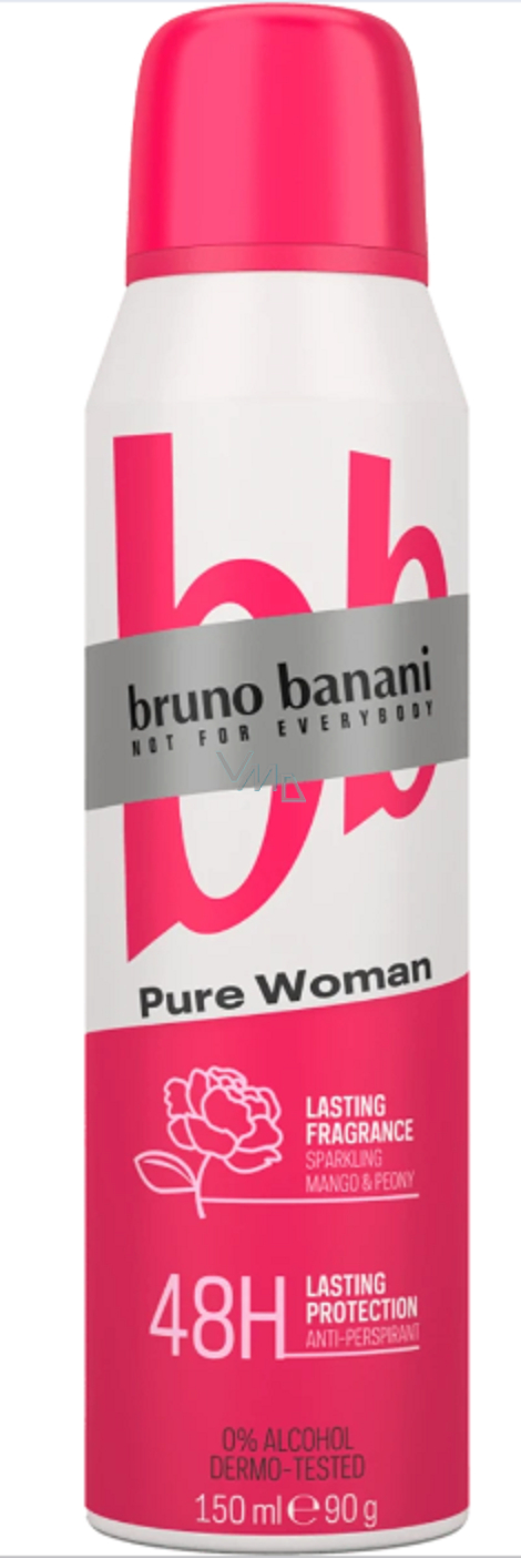 Deodorant sprej Bruno Banani Pure Woman je díky použití vícero top tónů a jemnější koncentraci vůní je složení dokonalou kombinací jemného a svěžího aroma s lehkým vodním složením. Květinově ovocná vůně pro ženy vás zahalí tóny frézie, černého rybízu a zelené mandarinky. Srdce je složeno z cyklámenu, pivoňky a manga. Základ vůně je tvořen dřevěnými tóny, ambrou a vanilkou. Navíc pomáhá chránit před potem a zápachem až po dobu 48 hodin. Užijte si svěží pocit pokožky po celý den.