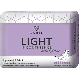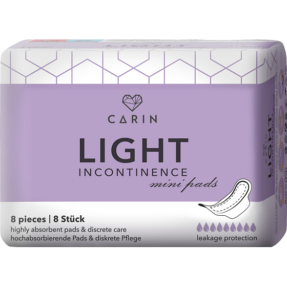 Die Carin Light Einlagen sind Inkontinenzeinlagen, die die gleiche Form wie Menstruationsbinden haben. Sie sind für Frauen mit gelegentlichem Harnverlust bestimmt. Sie verfügen über einen speziellen superabsorbierenden Kern, der eine schnelle Aufnahme von Urin ermöglicht und das Entweichen unangenehmer Gerüche verhindert. Die Einlagen bieten ein perfektes Gefühl von Sicherheit und Komfort und passen sich sanft der Körperform an. Sie sind super weich.