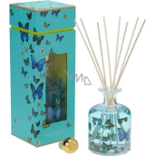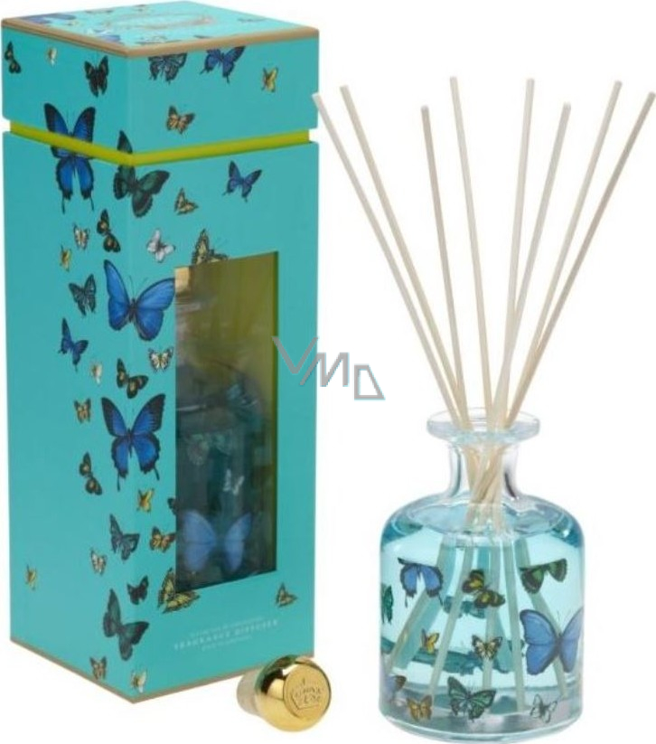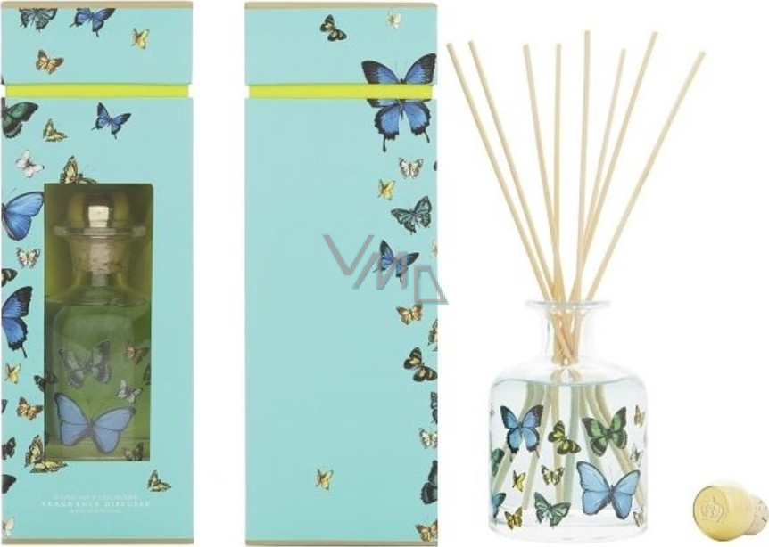 Difuzér s osmi ratanovými tyčinkami. Tento difuzér funguje na principu vzlínání, stačí jen ratanové tyčinky vložit do vonné esence, intenzitu si pak upravíte dle množství tyčinek v esenci. Barevné tyrkysové balení s motivem motýlků připomíná letní mořský vánek.