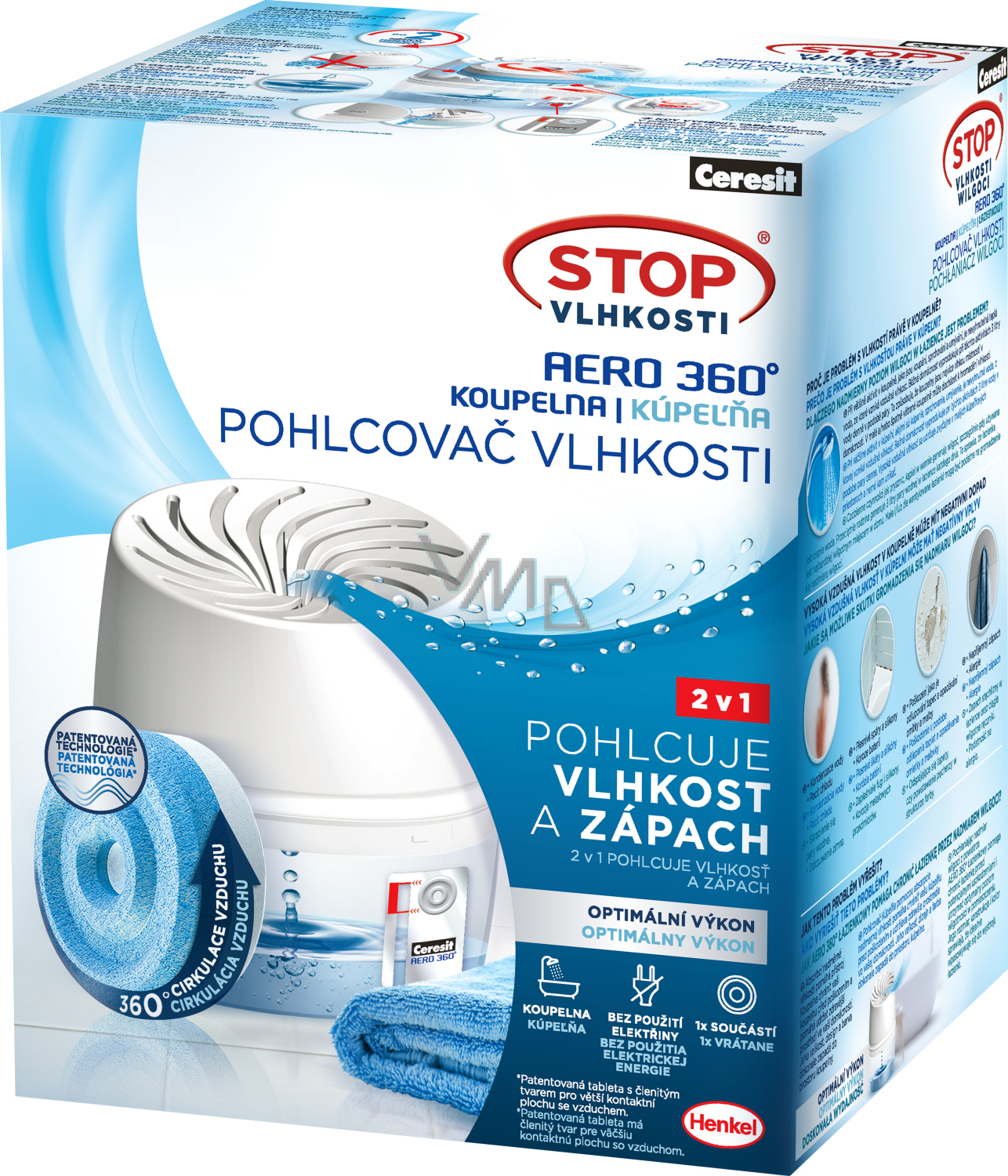 Der Feuchtigkeitsabsorber Ceresit Stop Vlhkosti Aero 360° hilft, überschüssige Feuchtigkeit in der Luft zu optimieren und neutralisiert Gerüche durch Luftzirkulation. Das Gerät hat eine aerodynamische Form und ein einzigartiges Luftloch, durch das die Luft zur Tablette strömt. Es ist hauptsächlich für den Einsatz in Badezimmern mit einer Fläche von bis zu 10 m2 bestimmt.