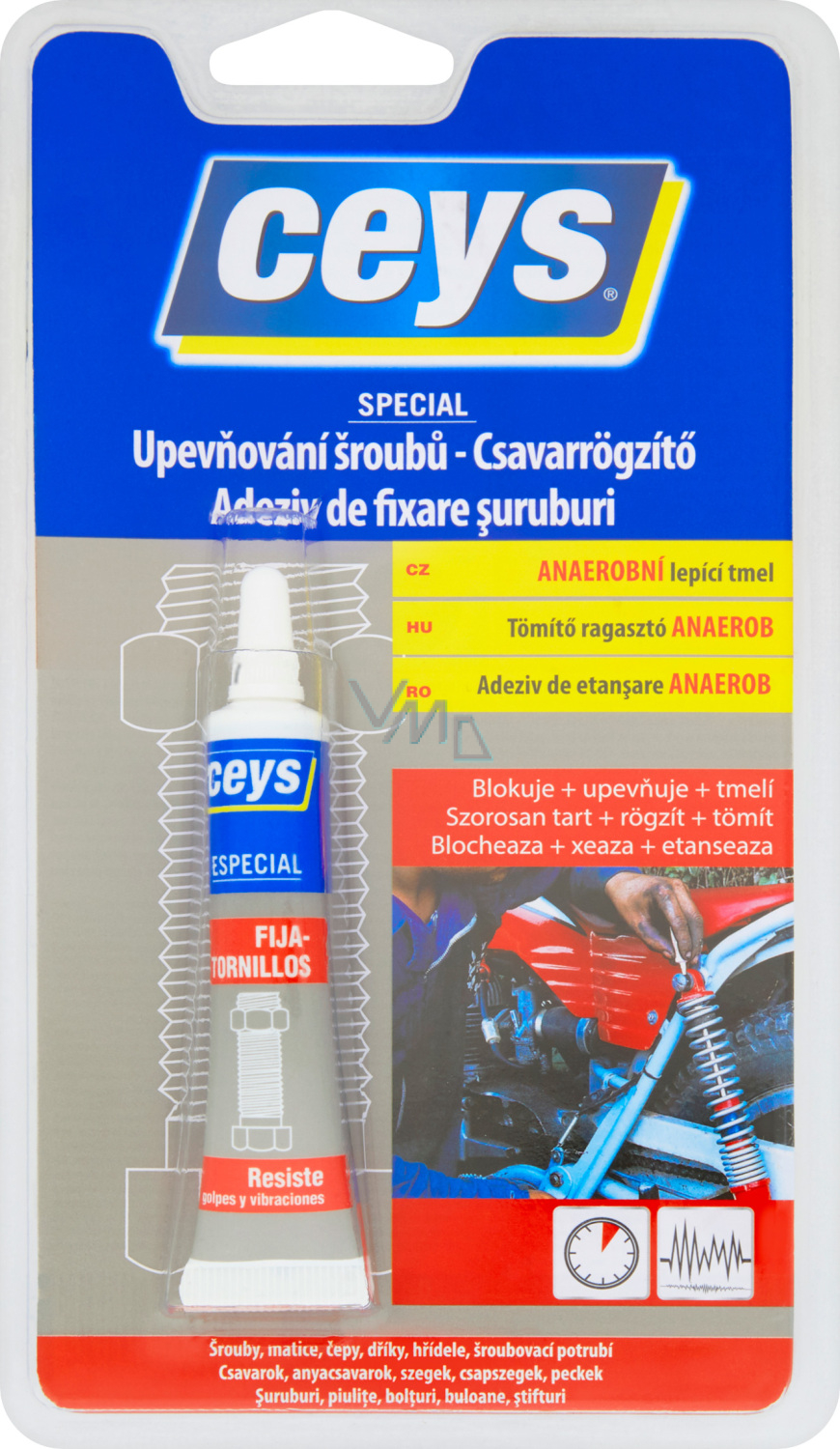 Der Kleber füllt den Raum zwischen Schraube und Gewinde. Sobald er aushärtet, verwandelt er sich in einen festen und stabilen Stoff, der Frost, Vibrationen, Ölen und Lösungsmitteln widersteht. Er lässt keine Feuchtigkeit und Schmutz durch.