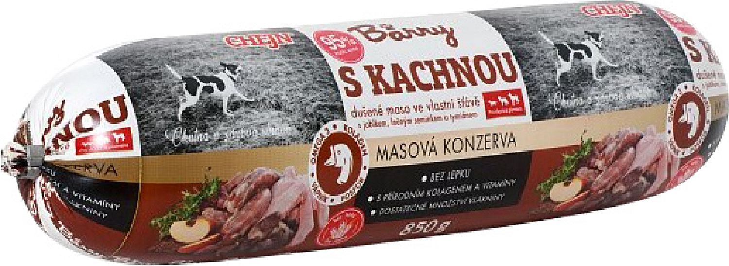 Zutaten: Fleisch und Fleischprodukte, Entenfleischabschnitte, Hälse, Flügel, Mägen, Leber, Herzen, Reismehl, Äpfel, Leinsamen und Thymian