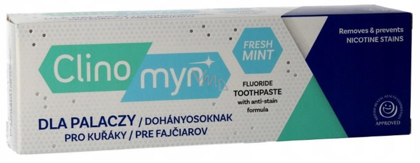 Kouříte? Tak pasta CLINOMYN Fresh Mint pro kuřáky (Smokers) je zaměřená na hloubkové čištění a odstraňování skvrn od nikotinu, kávy, červeného vína a jiných nežádoucích barviv. Unikátní je zejména svou hloubkově čistící složkou Polynam.
