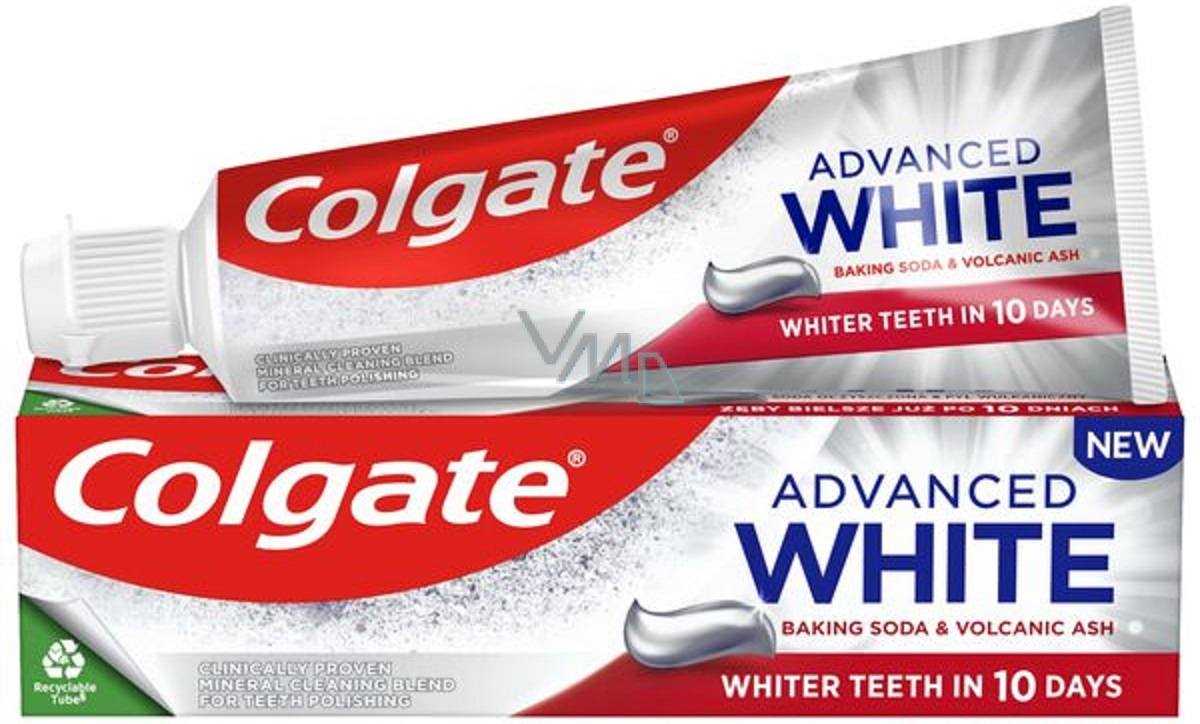 Die Zahnpasta Colgate Advanced White Baking Soda & Volcanic Ash entfernt klinisch nachweislich Oberflächenflecken und sorgt für weißere Zähne in 10 Tagen. Sie bekämpft Karies und hilft, Plakette zu entfernen. Diese Bleichzahncreme wurde mit einer spezialisierten mineralischen Reinigungslösung entwickelt, die klinisch nachgewiesen hat, dass sie Oberflächenflecken entfernt, für natürlich weißere und glänzendere Zähne in 10 Tagen. Die Paste ist zudem zahnschmelzfreundlich und kann täglich verwendet werden. Sie enthält Fluoride, hilft, Plaque beim regelmäßigen Zähneputzen zu entfernen, frischt den Atem auf und bekämpft Karies für gesunde Zähne und ein strahlendes Lächeln.
