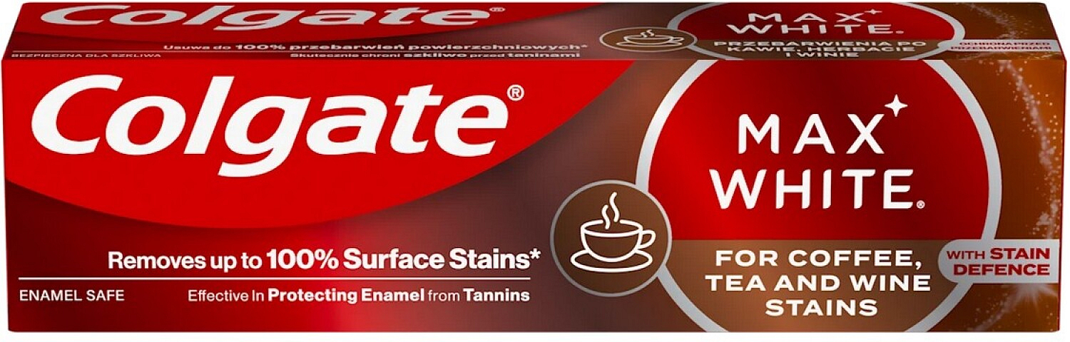 Colgate Max White One Coffee, Tea & Wine Zahncreme ist geeignet für die tägliche Zahnpflege mit dem Fokus auf die Entfernung von Flecken, die durch Kaffee, Tee und Wein verursacht werden. Sie hilft, die Zähne sauber zu halten und trägt zu einem weißeren Aussehen bei.