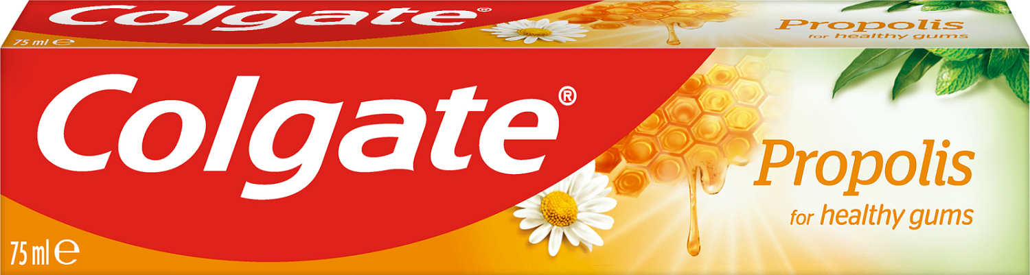 Calciumcarbonat, Wasser, Sorbit, hydriertes Silika, Natriumlaurylsulfat, Aroma, Natriummonofluorophosphat, Cellulosegummi, Magnesiumaluminosilikat, Natriumcarbonat, Benzylalkohol, Natriumsaccharin, Natriumbicarbonat, Propolisextrakt, Limonen.