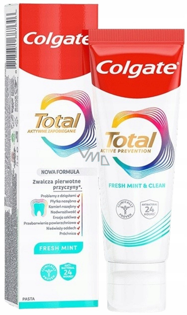 Chraňte svůj úsměv se zubní pastou Colgate Total. Aktivní prevence Fresh Mint nabízí vylepšené složení pro účinnou prevenci ústních problémů. Tato pasta, vyvinutá vědecky pro aktivní prevenci, je navržena tak, aby se zaměřila na původní příčiny problémů v ústní dutině a poskytovala vyšší účinnost při jejich prevenci. Klinicky ověřená 24hodinová antibakteriální ochrana a unikátní systém stabilizované aktivní složky zajišťují dlouhotrvající ochranu. Pasta s patentovanou preventivní technologií pomáhá chránit před 8 nejčastějšími problémy ústní dutiny, jako jsou zubní kaz, záněty dásní a zápach z úst. Díky svěží mátové chuti zajišťuje i dlouhotrvající svěží dech. Pro váš úsměv je to ochrana, kterou potřebujete, než se problémy objeví.