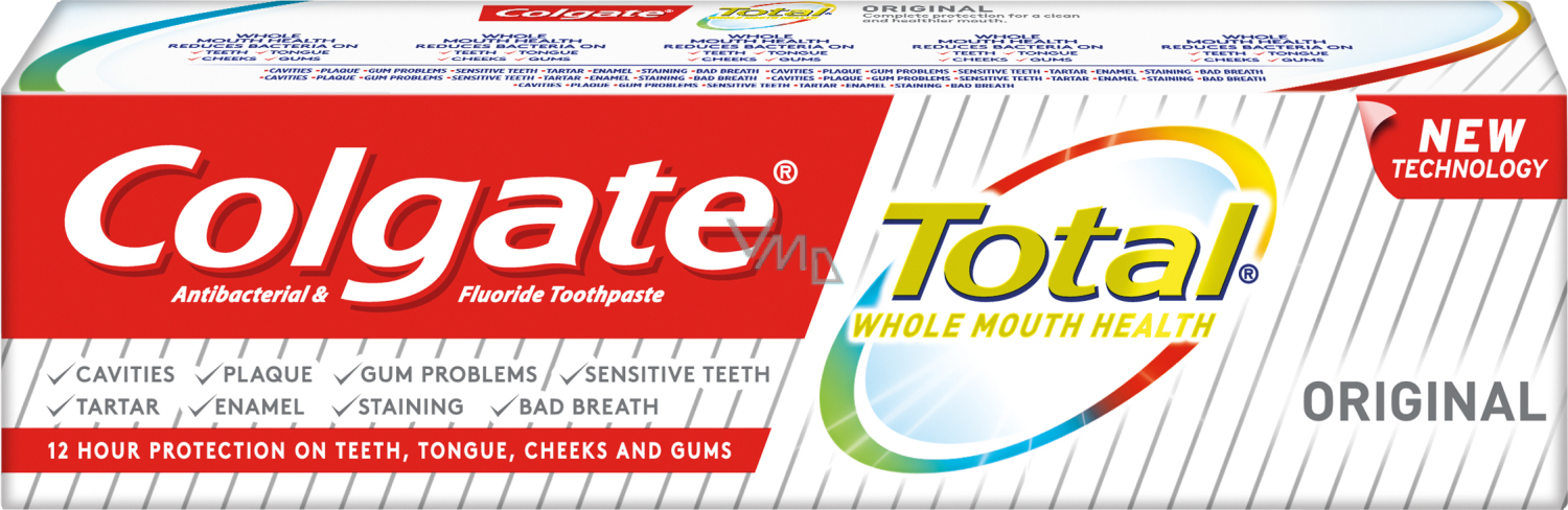 Die Colgate Zahnpasta Total Original garantiert umfassenden Schutz für Ihren Mund. Die Paste sorgt für sauberere und gesündere Zähne. Außerdem schützt sie wirksam Ihre Zähne vor Karies und löst Probleme mit empfindlichem Zahnfleisch. Darüber hinaus reduziert sie sehr effektiv die Anzahl der Bakterien auf den Zähnen, der Zunge, den Schleimhäuten und dem Zahnfleisch. Umfassenden antibakteriellen Schutz und einen effektiven Kampf gegen Zahnerkrankungen und Zahnfleischerkrankungen bietet die Paste bis zu 12 Stunden. Die Colgate Total Zahnpasta hilft zudem, die Häufigkeit von Zahnfleischentzündungen um bis zu 88 % signifikant zu verringern. Damit schützt sie den Mund vor schädlichen Substanzen. Daher ist die Colgate Total Original Zahnpasta der richtige Schritt für gesunde Zähne und Zahnfleisch ist die Colgate Total 12 Zahnpasta.