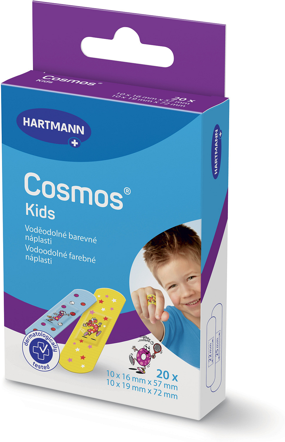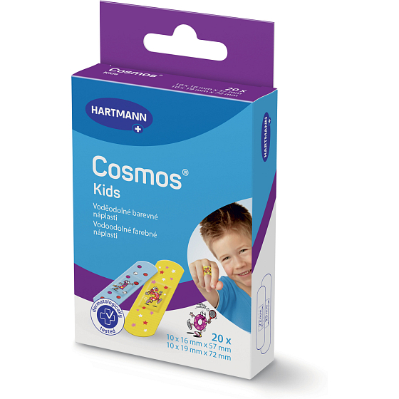 COSMOS voděodolná náplast byla speciálně vyvinuta pro potřeby citlivé dětské pokožky. Je opatřena obrázky, které vrátí dětem úsměv na tvář. Náplast je hypoalergenní, dokonale prodyšná a šetrná k pokožce, neslepuje se s ránou. V balení je 20ks, 2velikosti. Odstraníte ji bez bolesti.