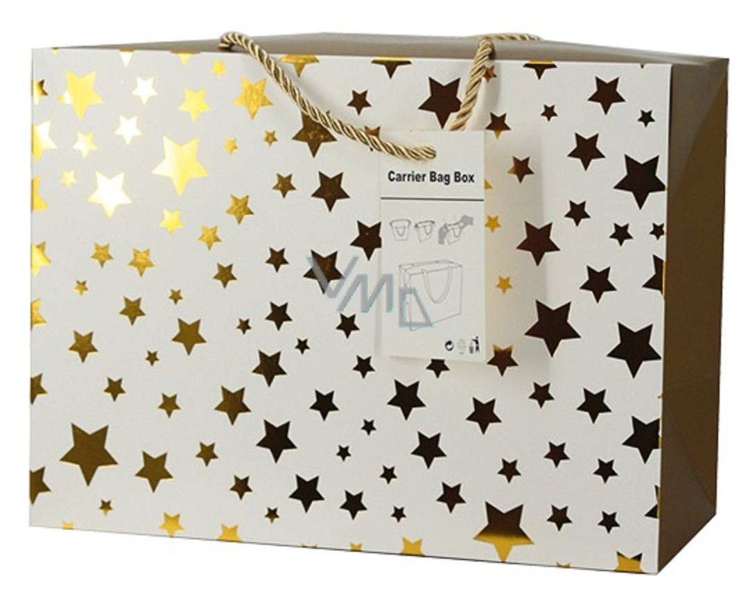 Dárková papírová taška se zlatými prvky lze jednoduše složit podle přeložených okrajů a vytvořit z ní dárkovou krabičku. Krásně zabalený dárek nemusí být jen otázkou šikovnosti. Snadným řešením jsou elegantní dárkové tašky.