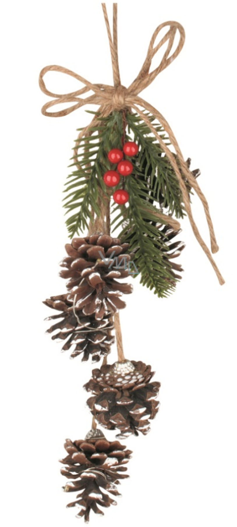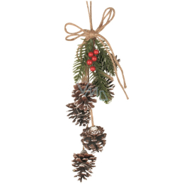 Vykouzlete si tu pravou vánoční atmosféru ve svém domově s dekorací se šiškami a jehličím! Dekoraci snadno zavěsíte třeba na vchodové dveře či věnec. Celková délka dekorace je 40 cm. Baterie 2x AA nejsou součástí.