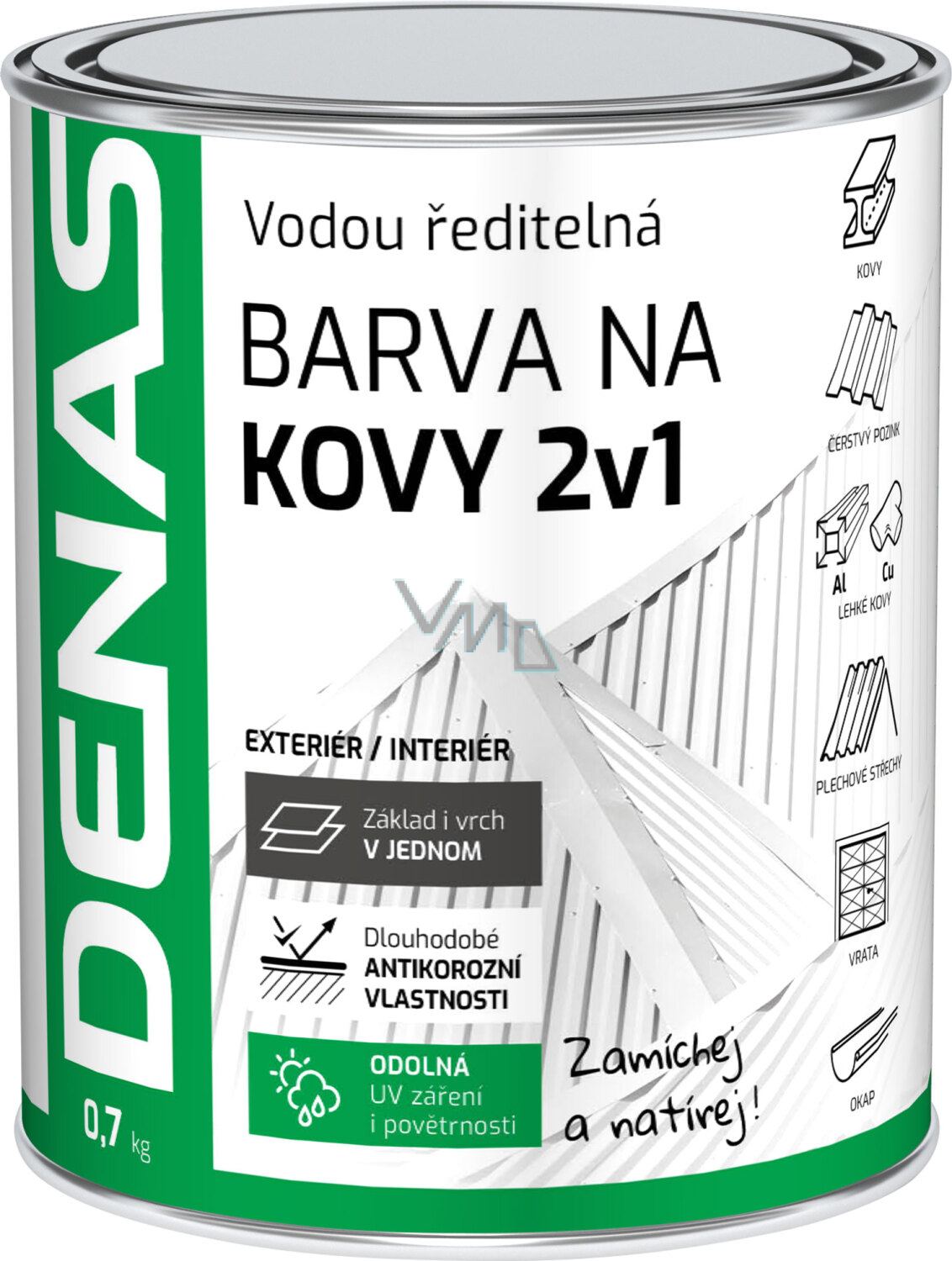 DENAS KOVY 2v1 je samozákladující, polomatná, antikorozní, vodou ředitelná barva určená k ochraně všech kovových podkladů. Nátěry mají antikorozní ochranu v celé tloušťce nátěrového filmu, vysokou odolnost působení povětrnosti, UV stabilitu. Barva na kov DENAS 2v1 je ideální k povrchovým úpravám střech, kovových konstrukcí, klempířských prvků, plotů, vrat, parapetů, stožárů, zábradlí i výrobků z litiny. Dokonale ochrání ocelové, železné, čerstvě pozinkované, hliníkové a měděné povrchy, umístěné v exteriéru a interiéru. Nátěry velmi rychle zasychají, jsou výborně soudržné s kovovými podklady, vysoce kryjí, mají dokonalý rozliv, jednoduše se aplikují.
