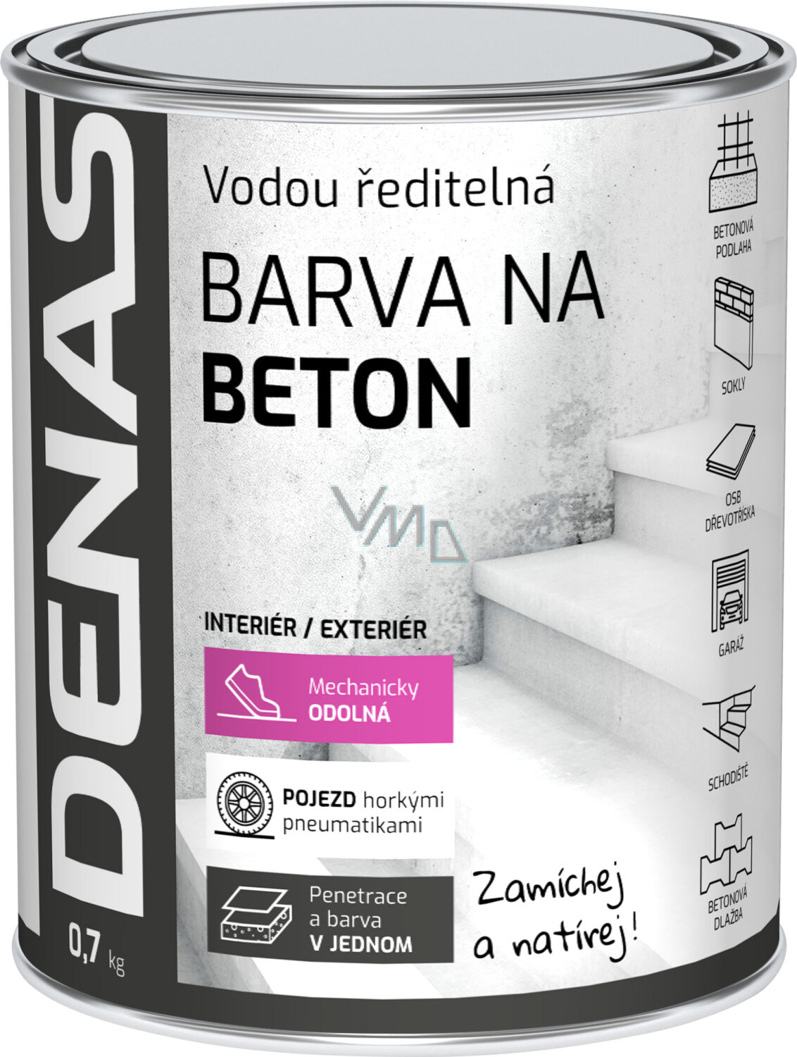 DENAS NA BETON je vrchní krycí pochozí vodou ředitelná barva určená k nátěrům betonových a vláknocementových ploch, soklů, plotů, schodišť, stěn a cementotřískových CETRIS a OSB desek. Nátěr výborně odolává působení povětrnosti a UV záření, má hydroizolační vlastnosti, je stálobarevný, otěruvzdorný, paropropustný, výborně se udržuje. Vykazuje vysokou kryvost, rychle zasychá, má výborné aplikační vlastnosti. Není vhodný na nevyzrálý beton.