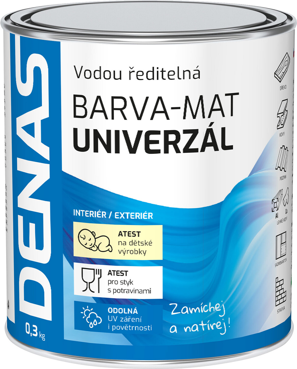 DENAS UNIVERZÁL MAT ist eine oberflächen wasserverdünnbare Farbe für Beschichtungen von Bauprodukten und Konstruktionen aus Holz, Metall, Baustellenmaterial, frischem verzinktem Blech sowie verzinkten Dachelementen, Aluminium, bestimmten Kunststoffen, Umakart, keramischen Fliesen mit Zusätzen von Silan, Gipskarton. Er erfüllt die Normen für Oberflächenbehandlungen von Produkten und Spielzeugen für Kinder von 0-3 Jahren (ČSN EN 71, Teil 3) und ist geeignet für den Kontakt mit Lebensmitteln. Die Beschichtungen haben hervorragende Beständigkeit, kreiden nicht und brechen nicht aufgrund von UV-Strahlung und Witterungseinflüssen, sie sind resistent gegenüber Reinigungsmitteln, die im Haushalt verwendet werden. Die gestrichenen Oberflächen sind extrem mechanisch widerstandsfähig und weisen eine lange Lebensdauer im Innen- und Außenbereich auf.