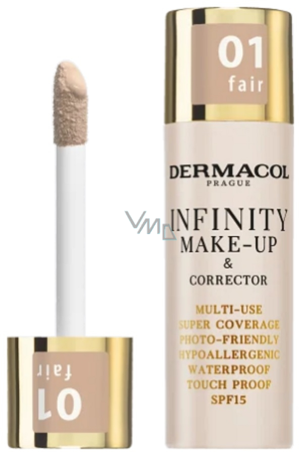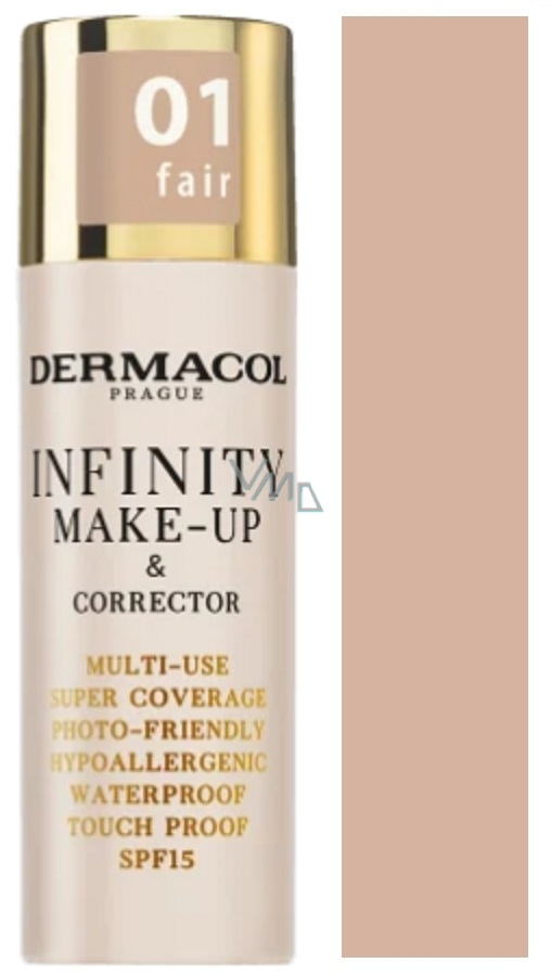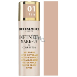 Dermacol make-up a korektor Infinity zakryje všechny nedokonalosti, pigmentové skvrny a dodává pleti bezchybný sametový vzhled. Bezvodá, extra lehká, vysoce krycí fluidní textura nezanechává pocit „těžké“ pleti. Obsahuje vitamín E a částečky jojobového vosku, který se při kontaktu s kůží rozehřeje a vytvoří ochrannou vrstvu. Složení je bez parabenů, konzervantů, parfemace a minerálních olejů.