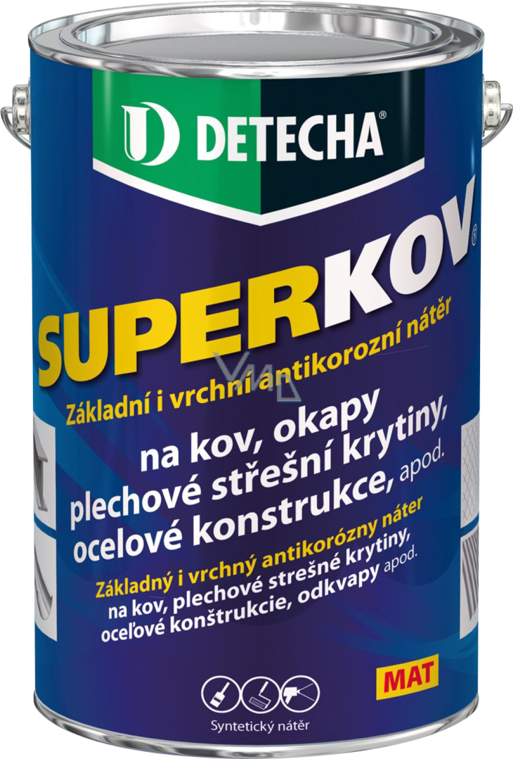 Grund- und Deckanstrich aus antikorrosiver synthetischer Farbe für Metall, bestimmt zur Oberflächenbehandlung von Metallmaterialien und zur effektiven Sicherung gegen Korrosionsbildung. Schafft einen hohen Barriereffekt gegen dauerhafte Einflüsse von Witterung und Sonnenstrahlen. Für einen langfristigen Schutz (bis zu 8 Jahre) genügen 2 - 3 Schichten Superkov ohne vorherigen Grundanstrich. SUPERKOV ist eine Grund- und Deckbeschichtung für Metall, Blechdachabdeckungen, Stahlkonstruktionen, Dachrinnen usw.