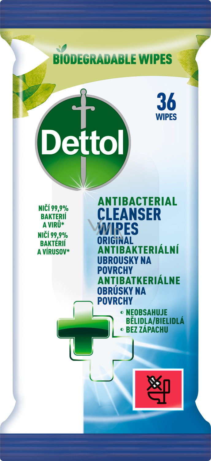 Dettol antibakteriální ubrousky na povrchy ničí 99% bakterií, včetně  E. coli, salmonelly, MRSA a viru chřipky. Ubrousky bez bělidla a barviv jsou určeny pro použití kolem dětského vybavení a ploch, kde se připravuje jídlo.