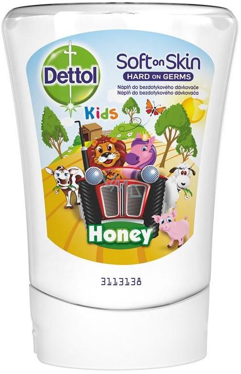 Tekuté mýdlo Dettol Kids Honey náhradní náplň do beztykového dávkovače. Jemné na kůži, drsné k mikrobům. Bezdotykový dávkovač mýdla Dettol Kids pomůže vašim dětem mýt si ruce.