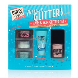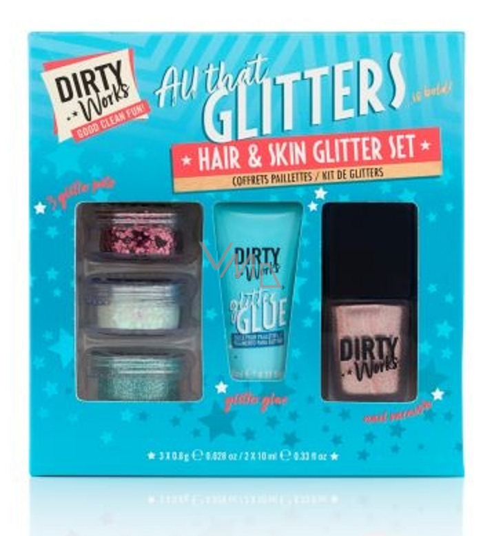 Dirty Works All That Glitters Glitzertasse 3 x 0,8 g + Glitzerkleber 10 ml + Nagellack 10 ml, Kosmetikset