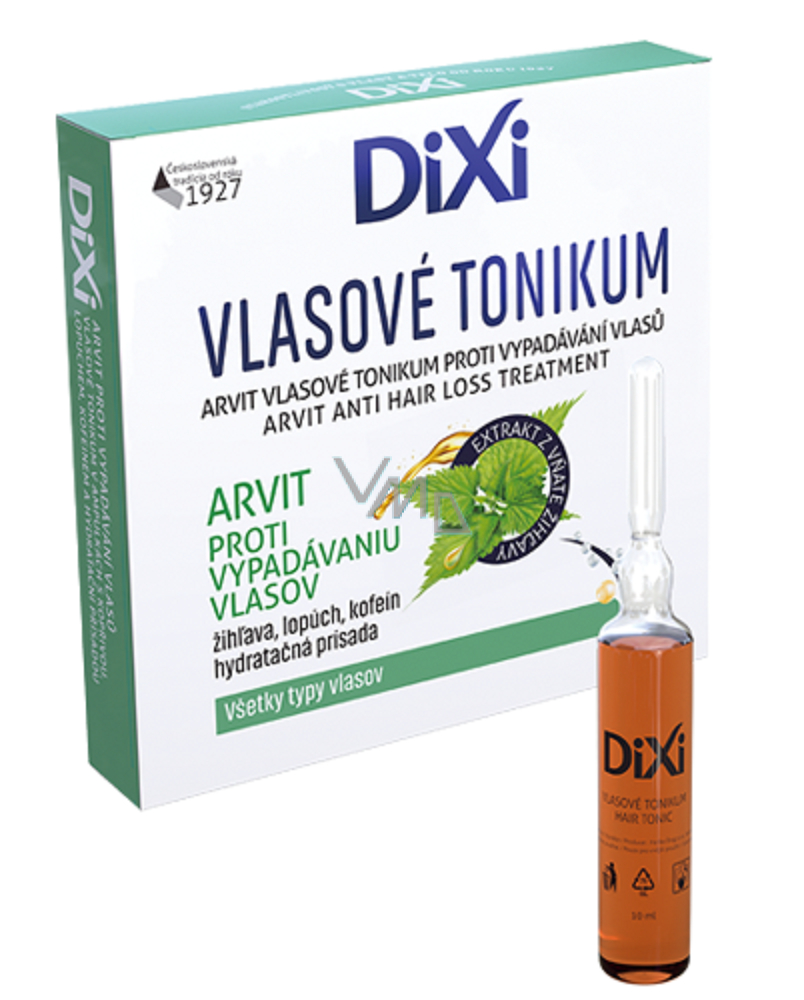 Vlasové tonikum Dixi Arvit bojuje proti vypadávání vlasů. Obsah účinných látek – extrakty z kopřivy a kořene lopuchu, kofein, provitamín B5, vitamín F a hydratační přísada – se spolu s aplikací pomocí masáže postarají o zdravou pokožku hlavy, posílení vlasů a zvýšený přísun živin do vlasových folikulů. Přírodní složky v toniku Dixi Arvit proti vypadávání vlasů se postarají o komplexní péči, abyste se mohli pyšnit krásnými a hustými vlasy.