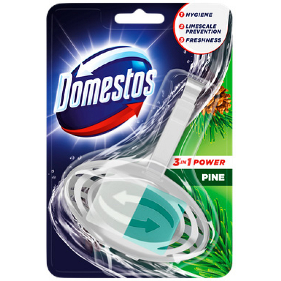 Domestos WC Block 3v1 Pine hinterlässt Ihre Toilette sauber, verhindert die Bildung von Kalk und sorgt für langanhaltende Frische mit Duft von Kiefer nach jedem Spülen.