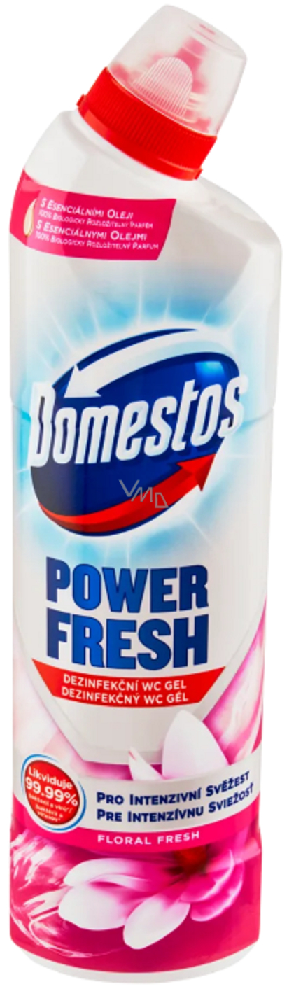 Domestos WC gel Floral Fresh likviduje 99,99 % bakterií a virů, odstraňuje zašlou špínu a vodní kámen a zanechává vaši toaletu čistou a voňavou. 100% biologicky rozložitelný parfém s esenciálními oleji pro intenzivní svěžest a odstranění zápachů!