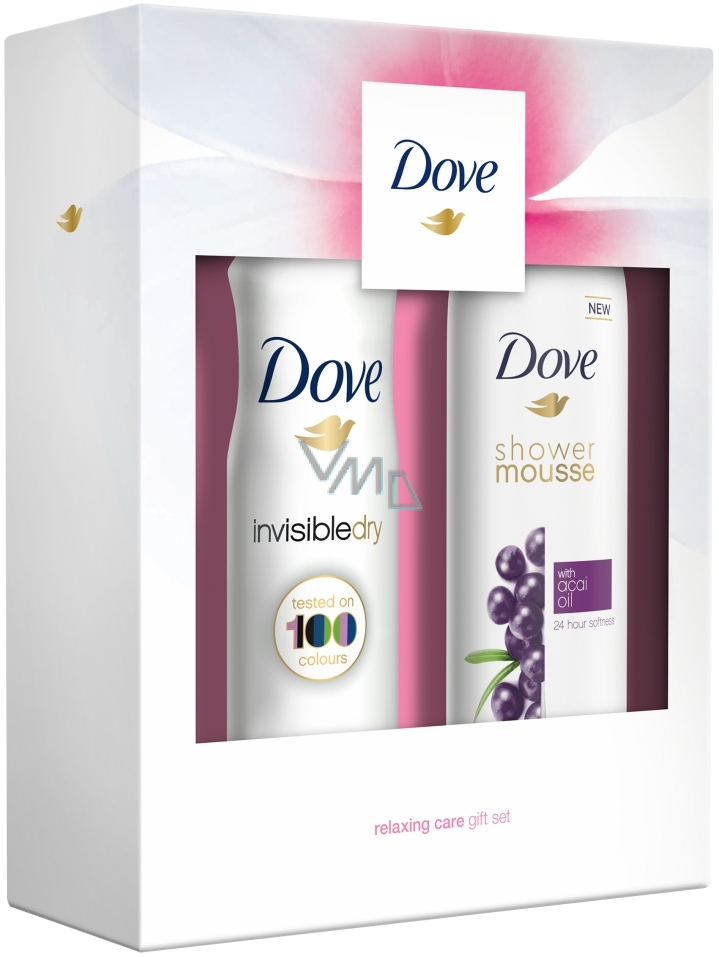Dárková kazeta DOVE Relaxing care je nádherným dárkem pro každou ženu, která ráda hýčká svou pokožku. Obsahuje přípravky pro každodenní péči, a to sprchovou pěnu a antiperspirant. Pečující sprchová pěna DOVE Acai Oil Shower and Shave Mousse s olejem Acai o objemu 200 ml jemně pokožku myje a zbavuje nečistot. Její hustá krémová konzistence ji zanechává sametově hebkou a hladkou. Složení sprchové pěny je obohaceno o esenciální olej z bobulí acai, který pokožku zvláčňuje, vyživuje a zahaluje do příjemné ovocné vůně. Přípravek můžete použít také pro holení.
