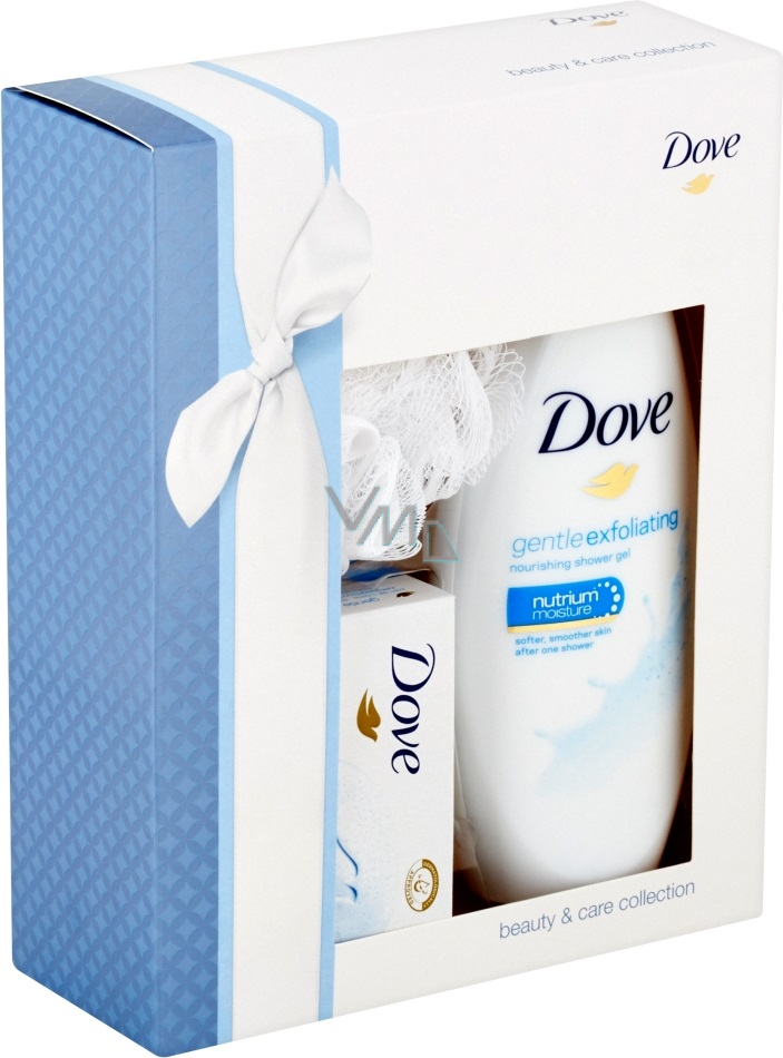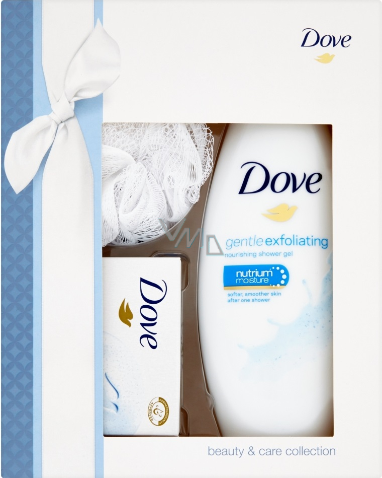Krásná a vyživená pleť již po prvním osprchování. Elegantní dárkové balení, které v sobě ukrývá praktickou sadu sprchového gelu a krémové tablety, potěší každého, kdo chce, aby byla jeho pleť krásně hladká a vyživená již během mytí. Sprchový gel Dove Gentle Exfoliating napomáhá odhalovat přirozený jas pokožky díky svému peelingovému účinku. Krémová tableta na mytí Dove obsahuje 1/4 hydratačního krému. Citlivou pokožku tváře proto nevysuší, ale zbaví ji nečistot a prachu po celém dni. Navíc s měkkou Dove houbičkou na mytí.